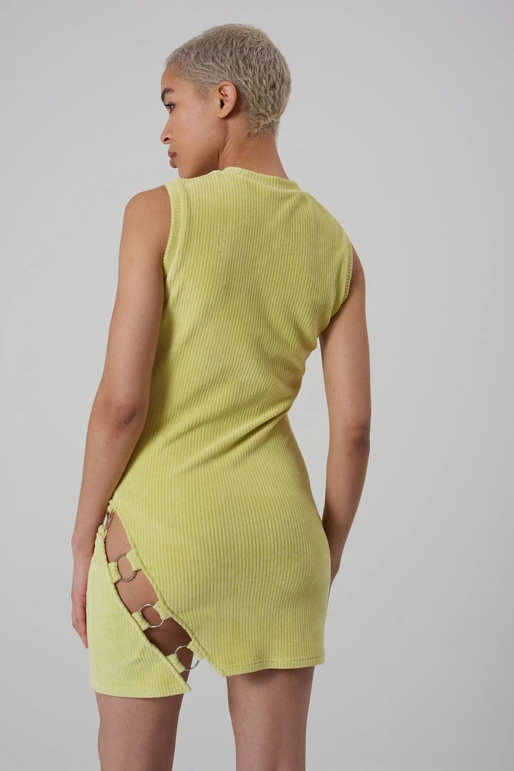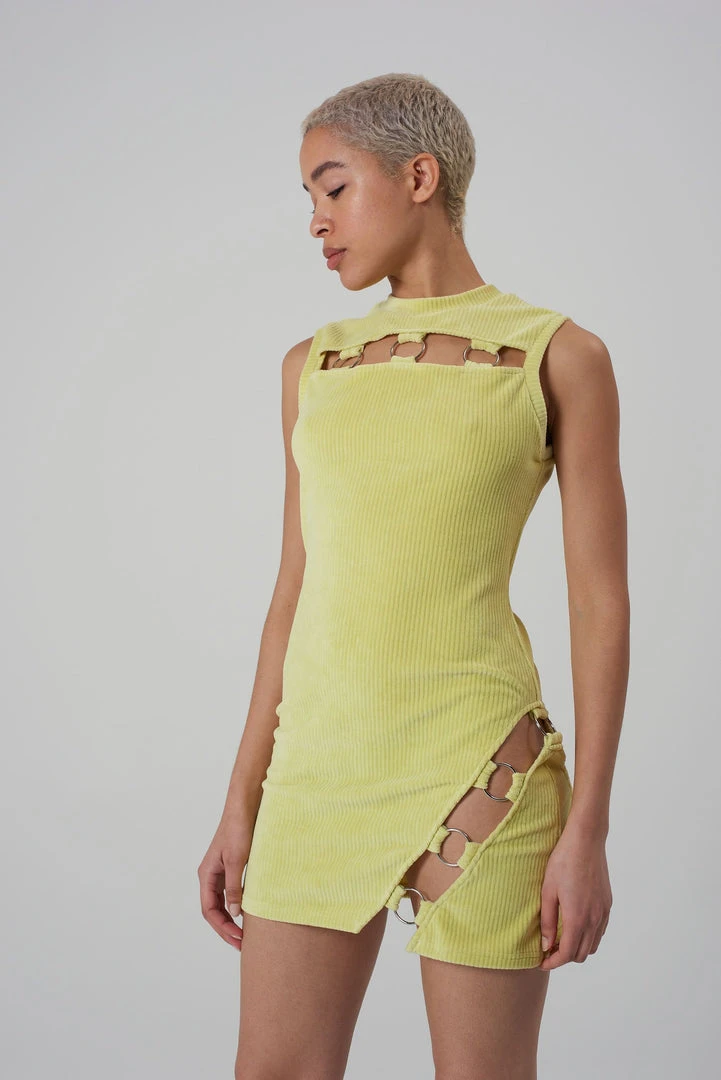 The Ragged Priest green velour mini dress with o-ring cut out detail.