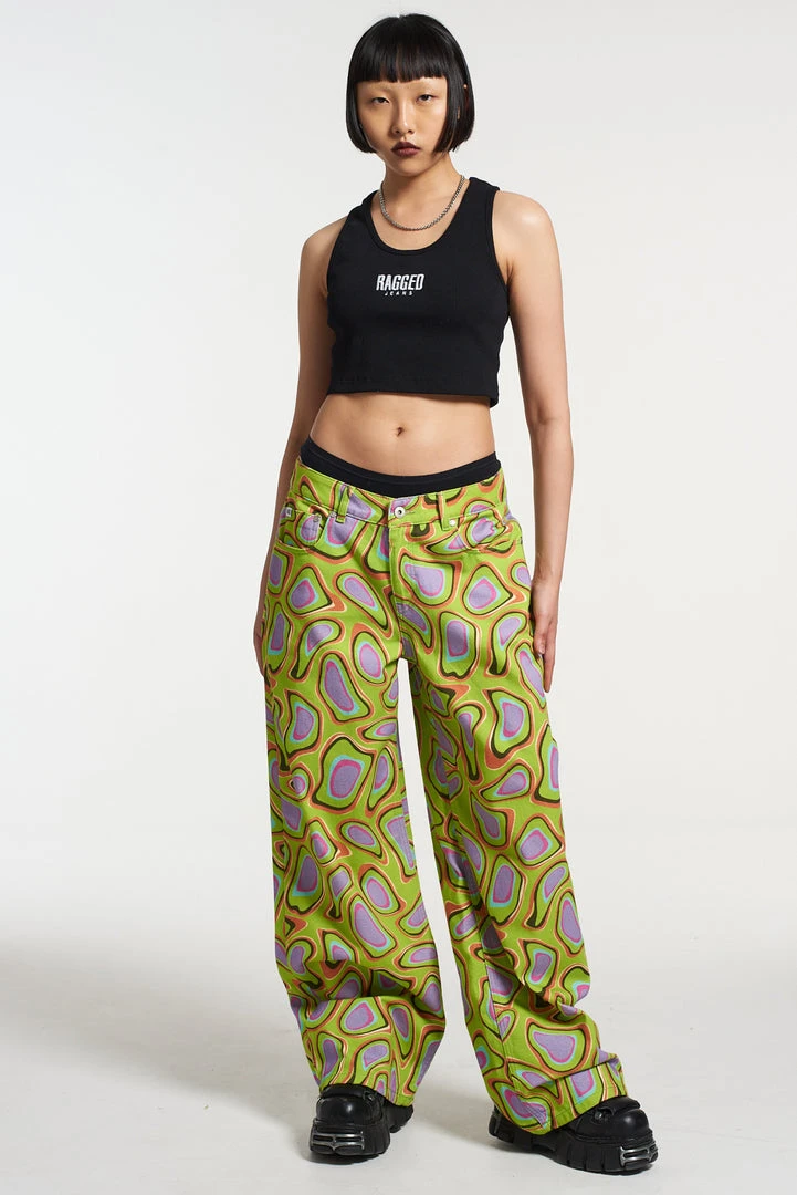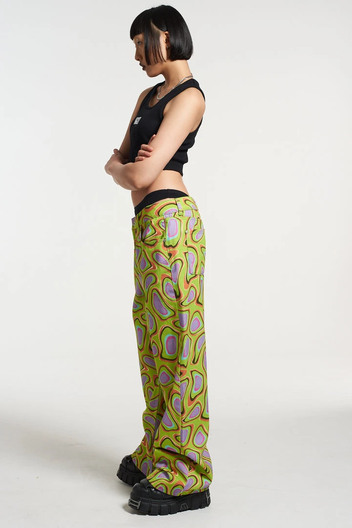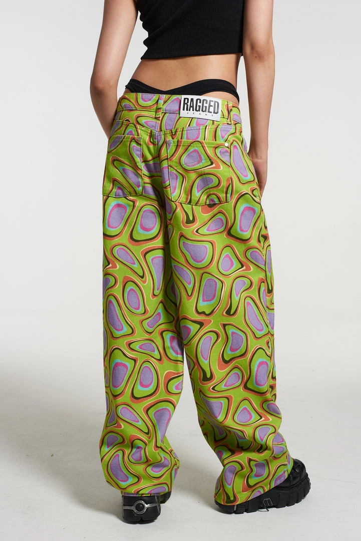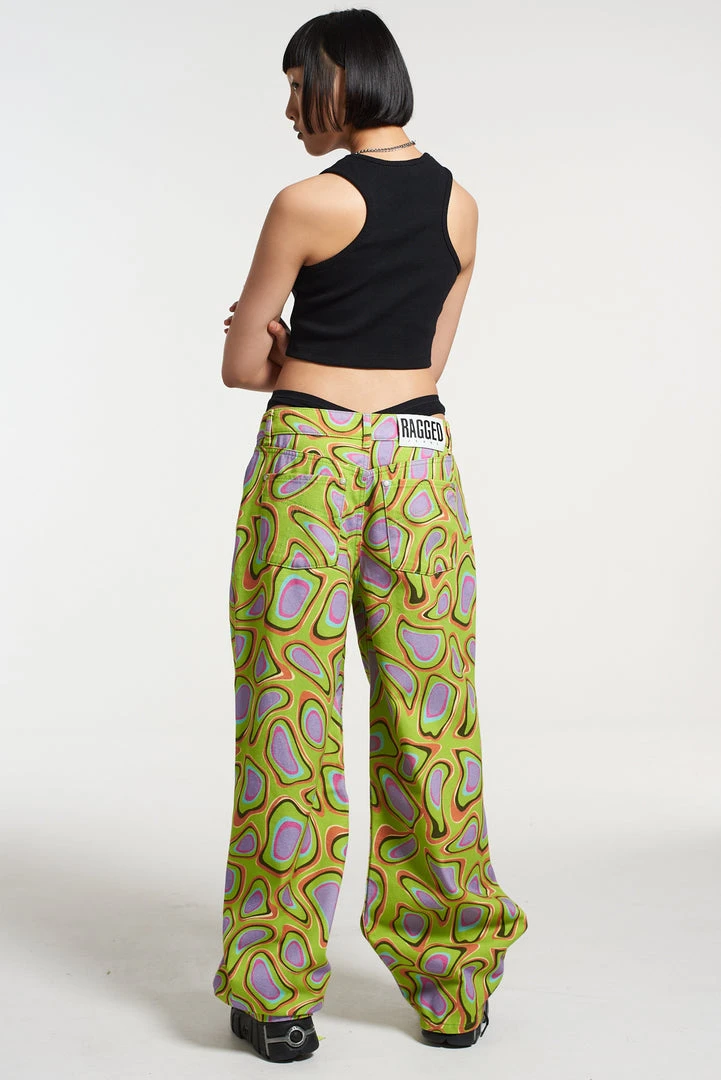 The Ragged Priest neon green release jeans with multicoloured aura pattern in purple, pink, orange, blue and yellow.Â