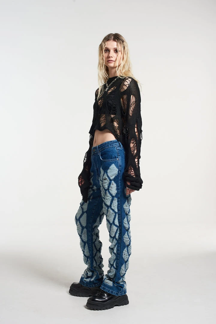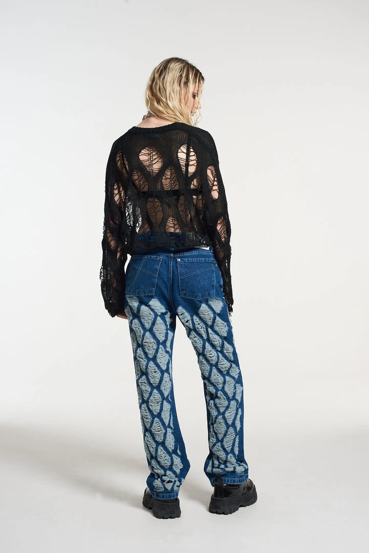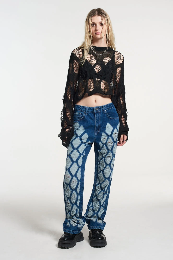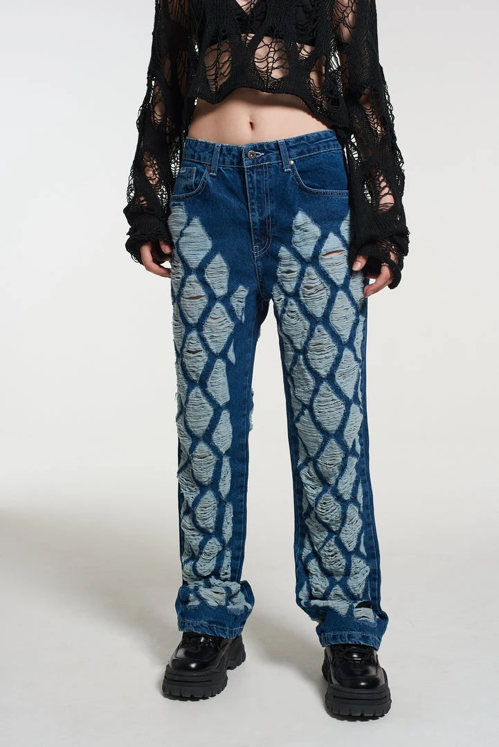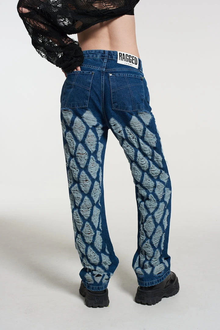 The Ragged Priest extreme distressed diamond pattern dad jean in a mid – dark blue denim wash.Â
