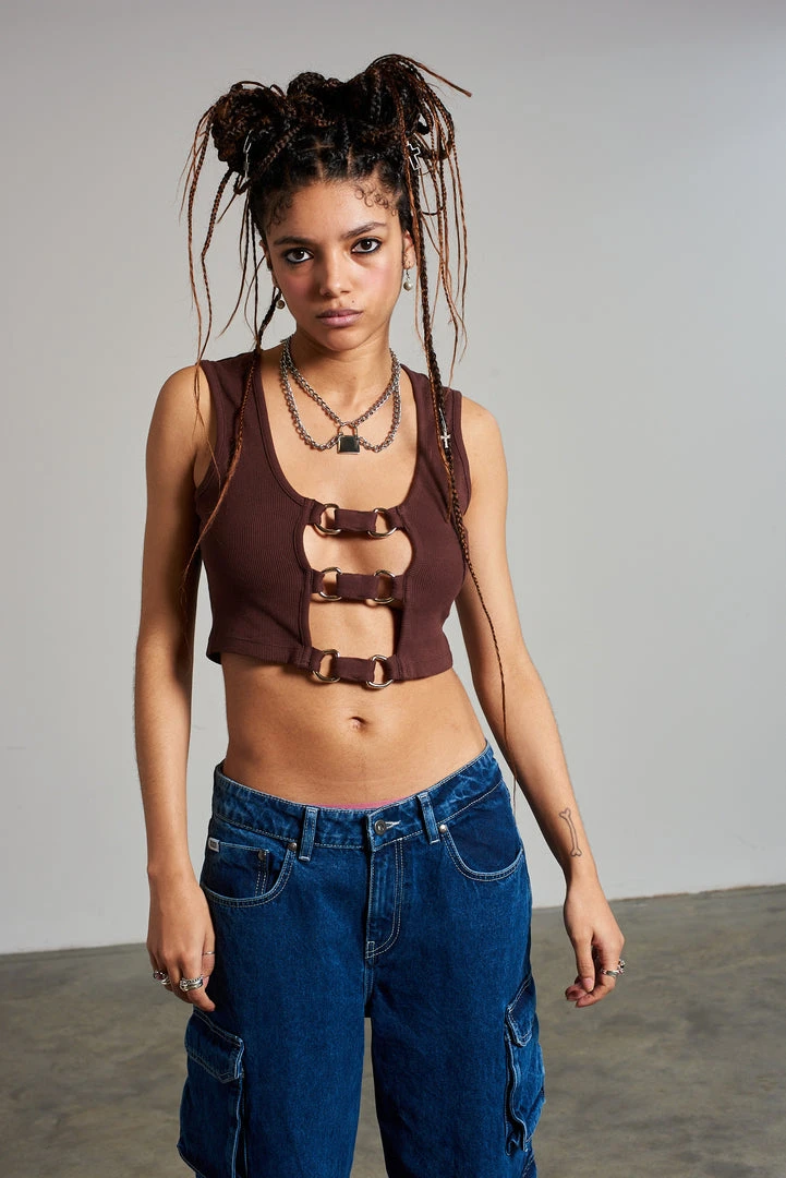 The Ragged Priest brown sleeveless ribbed top with d-ring and strap front detail.