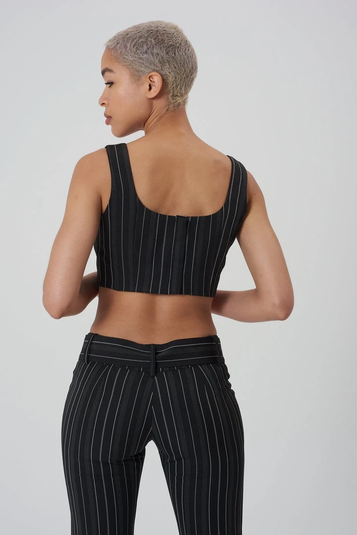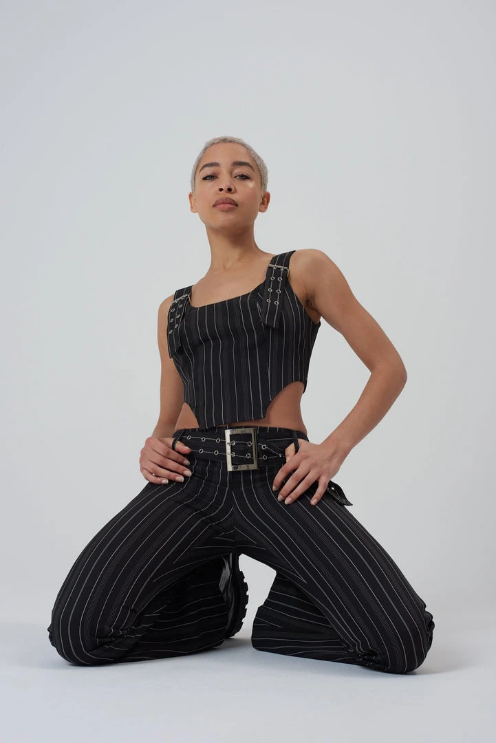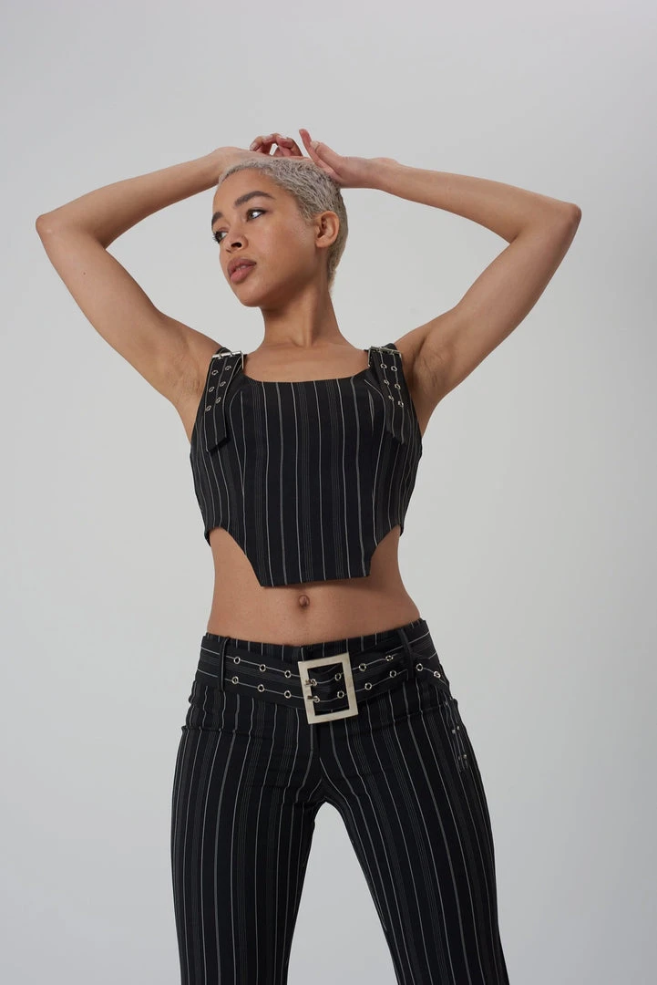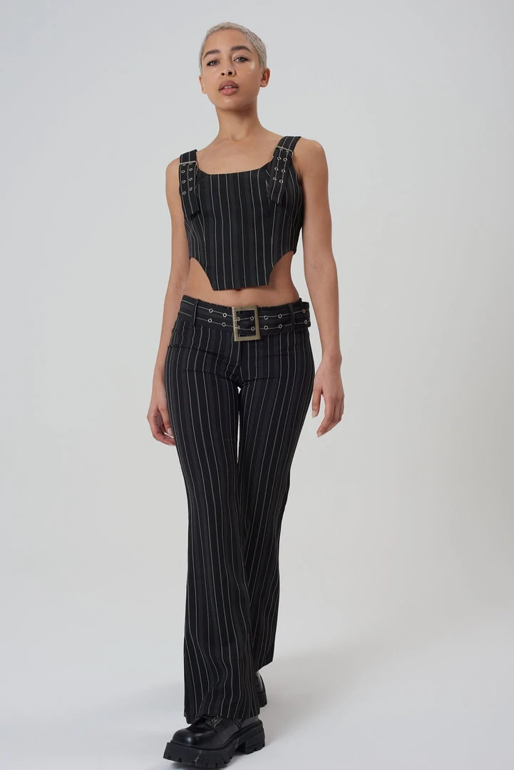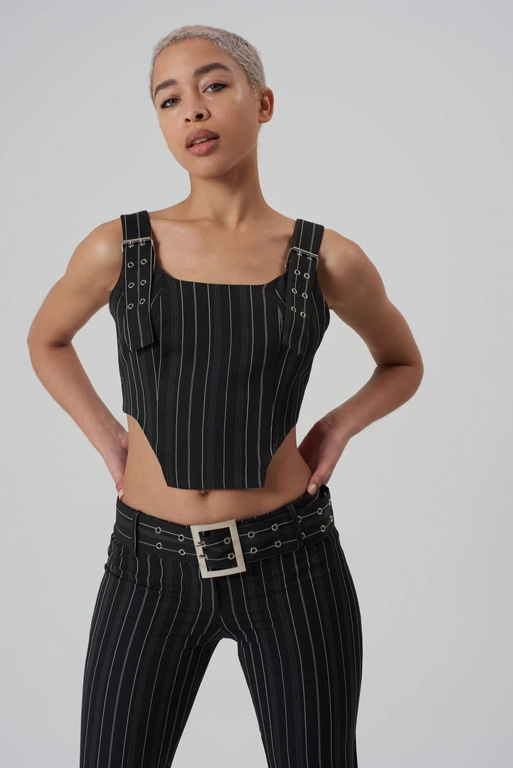 The Ragged Priest black pinstripe corset style top with double eyelet buckle shoulder straps.
