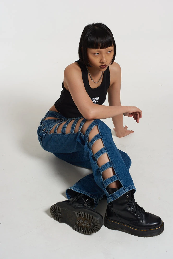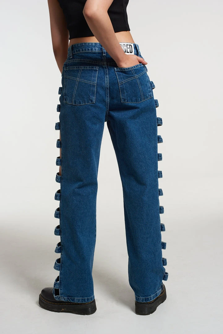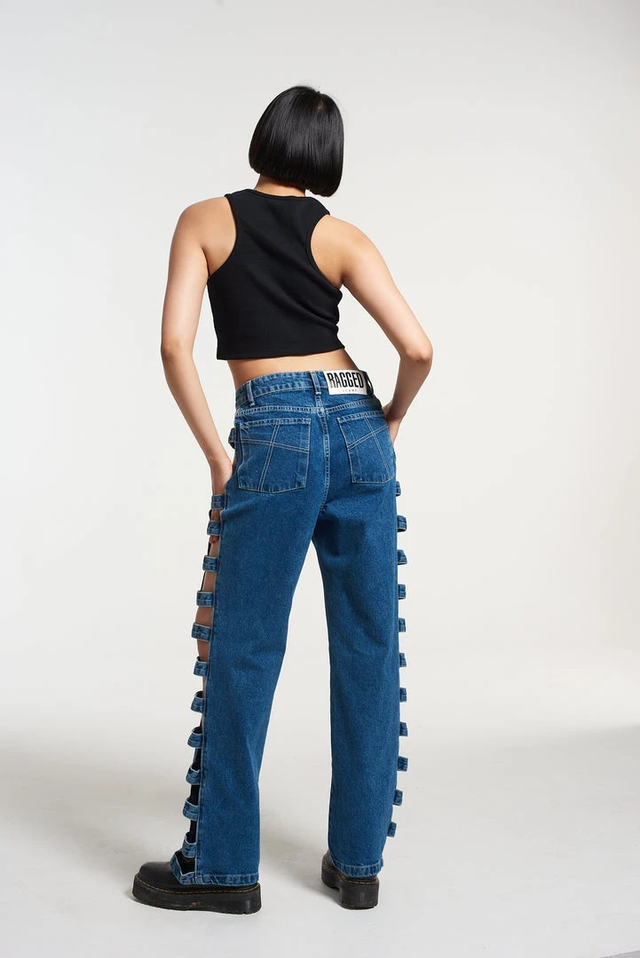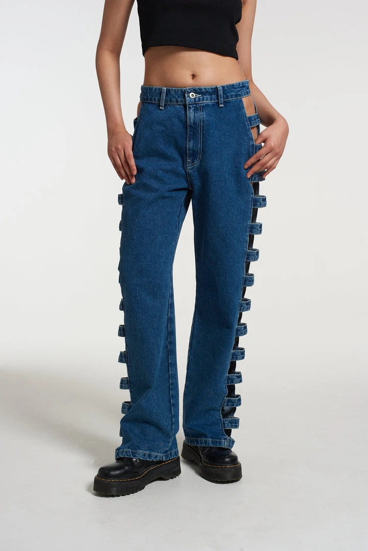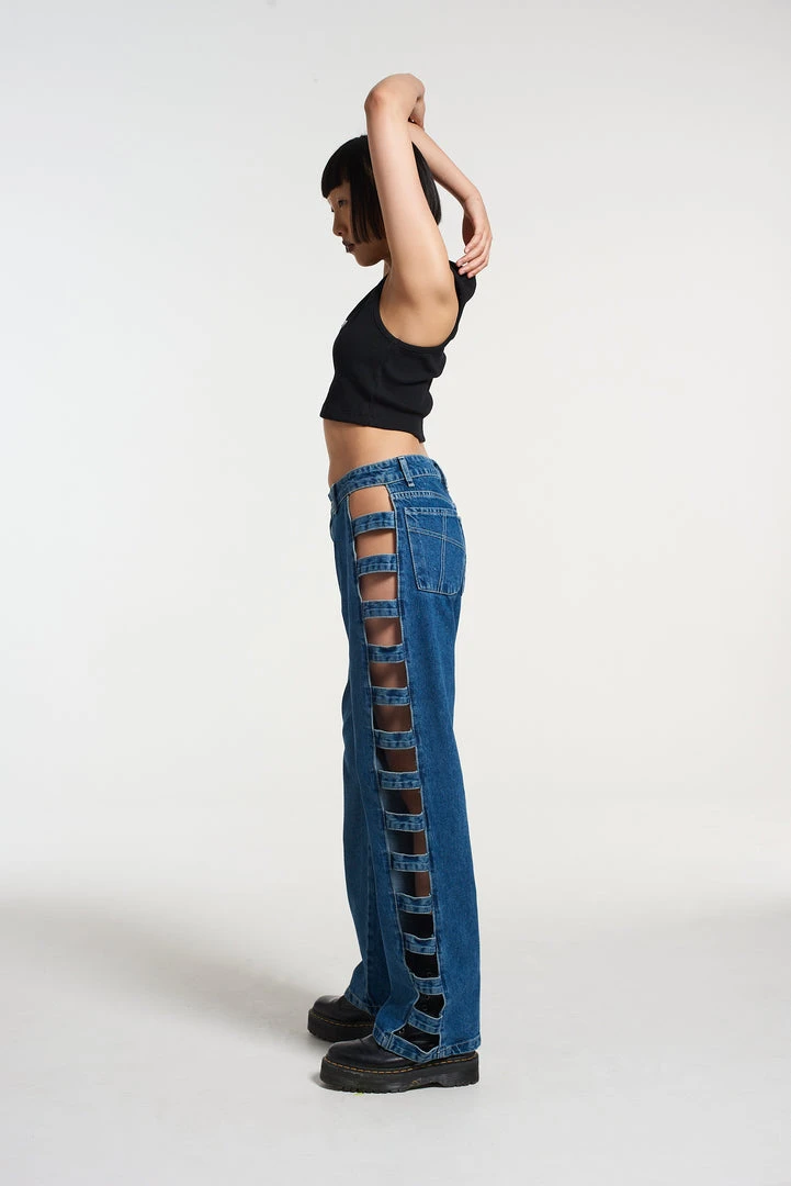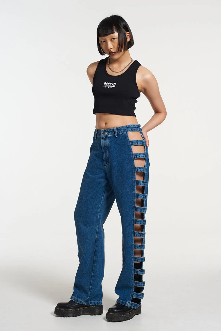 The Ragged Priest Cut out side seam detail jeans in our classic mid wash dad jean fit.