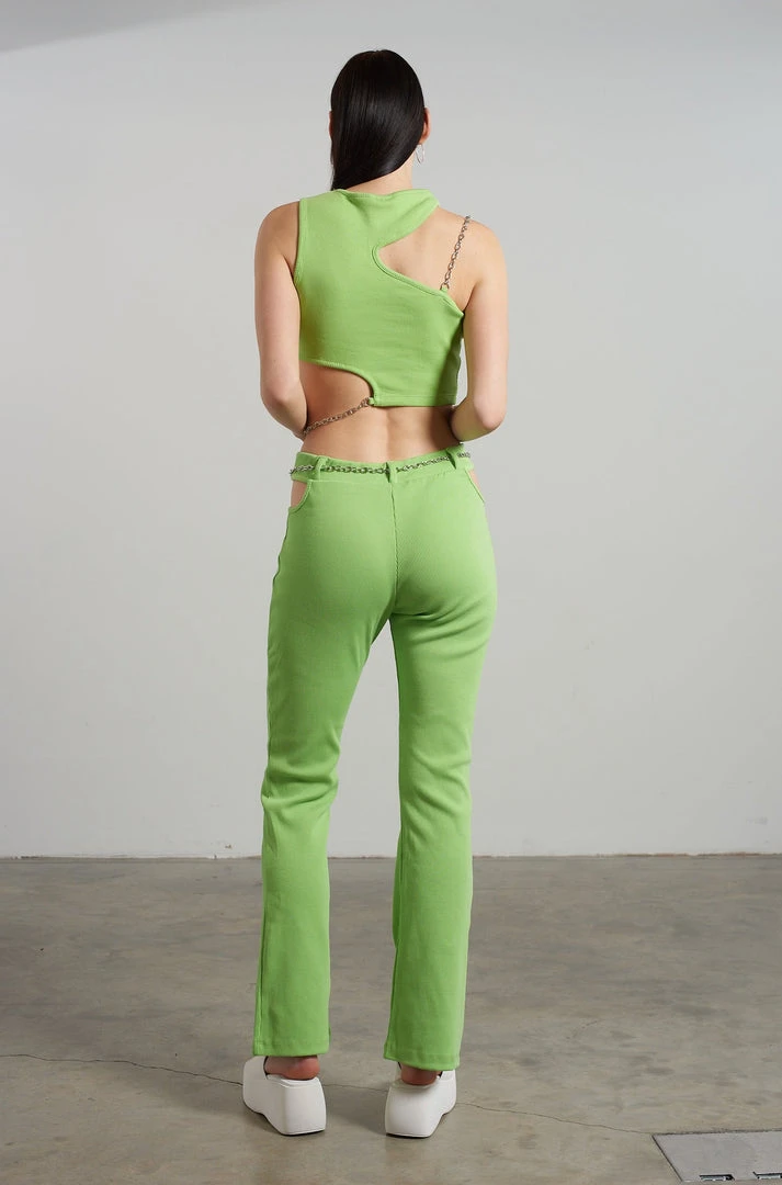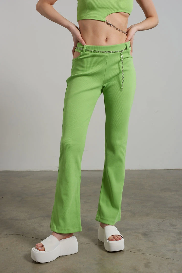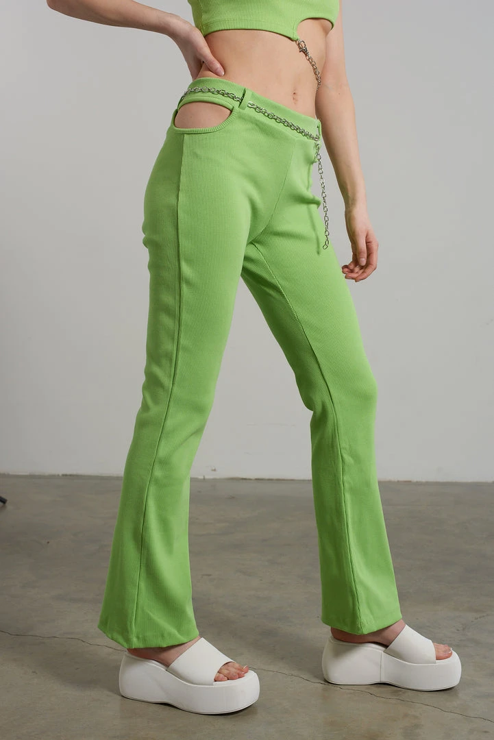 The Ragged Priest green ribbed flares with cut out waist and chain belt detail.