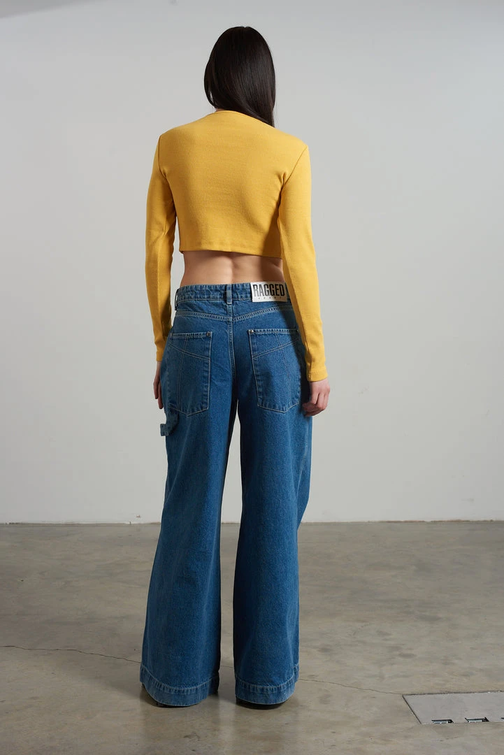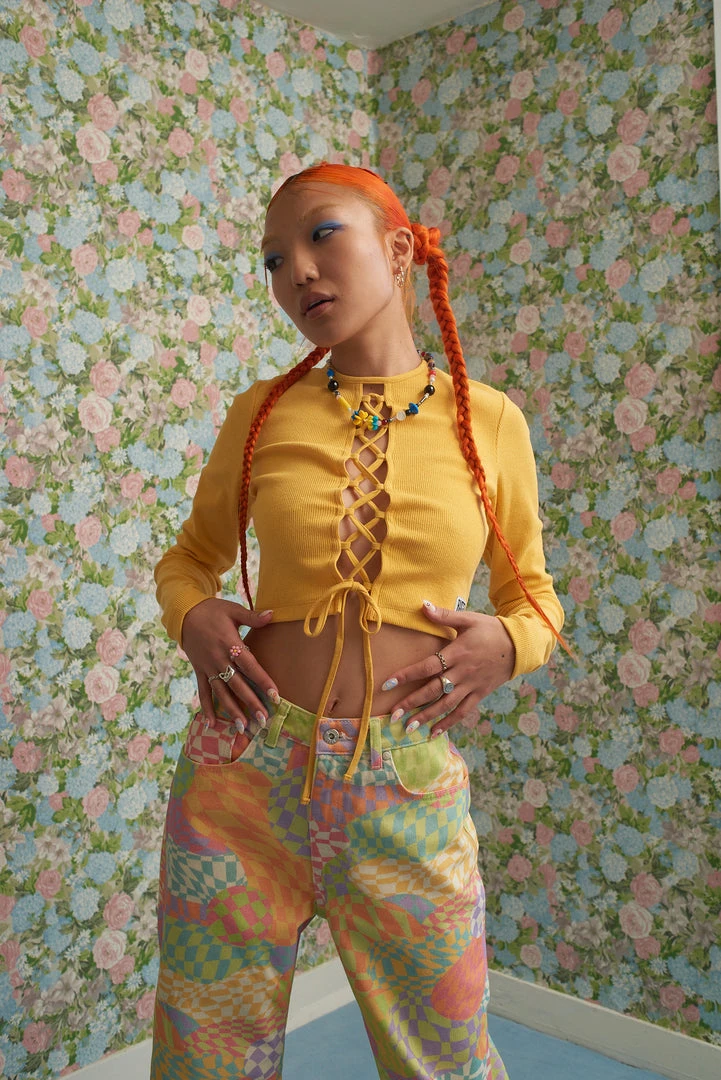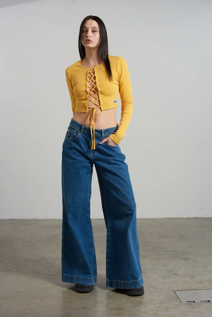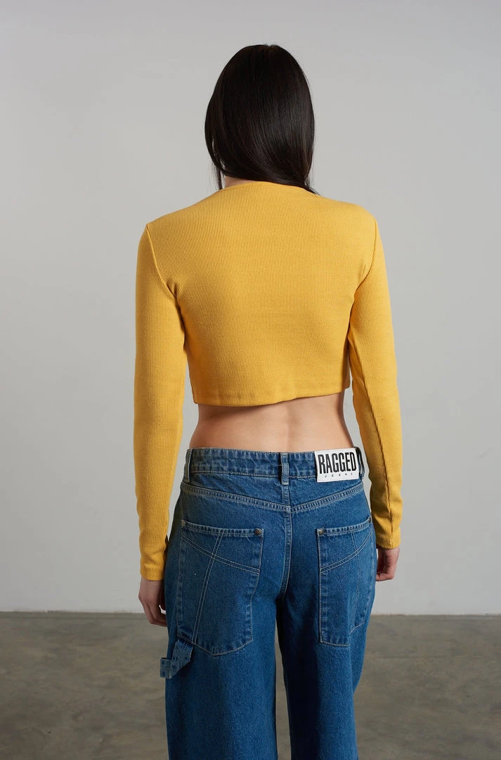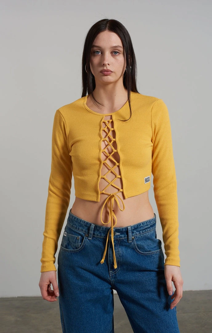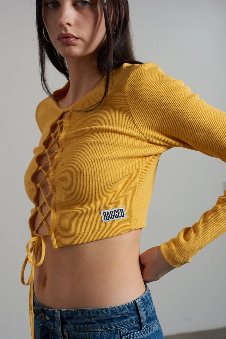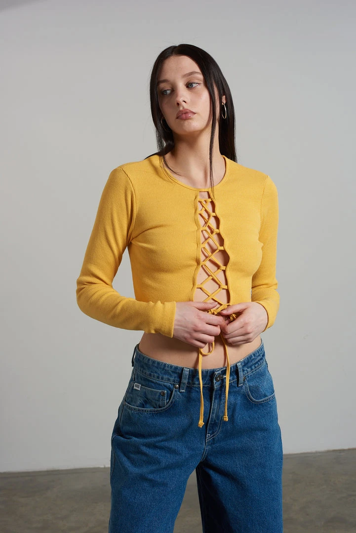 Ragged Jeans yellow lace-up long sleeve rib top.