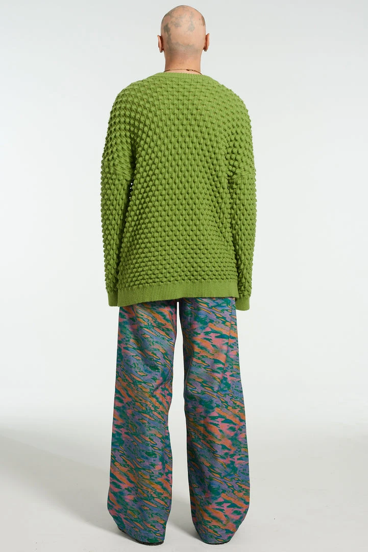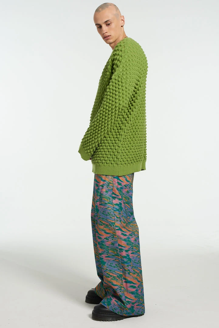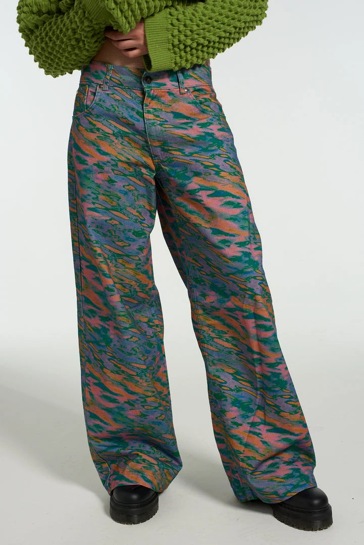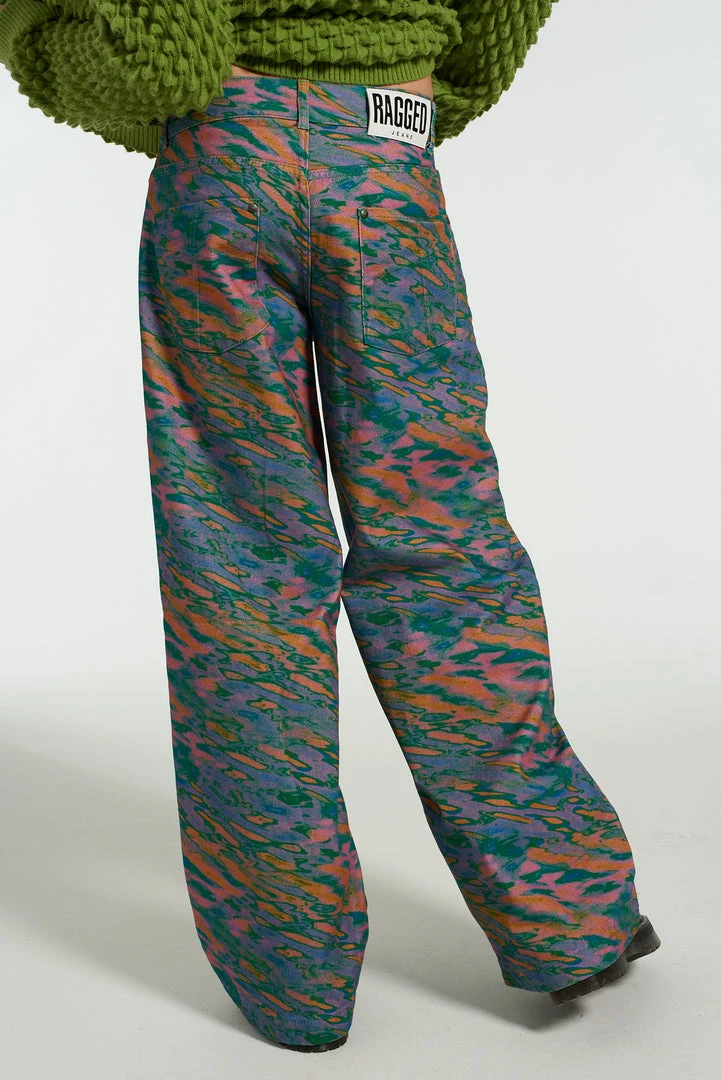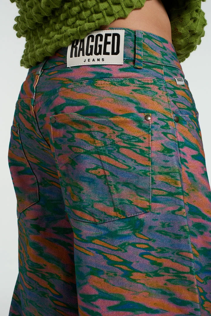 The Ragged Priest men’s wide leg jeans with graphic multi coloured water print design.