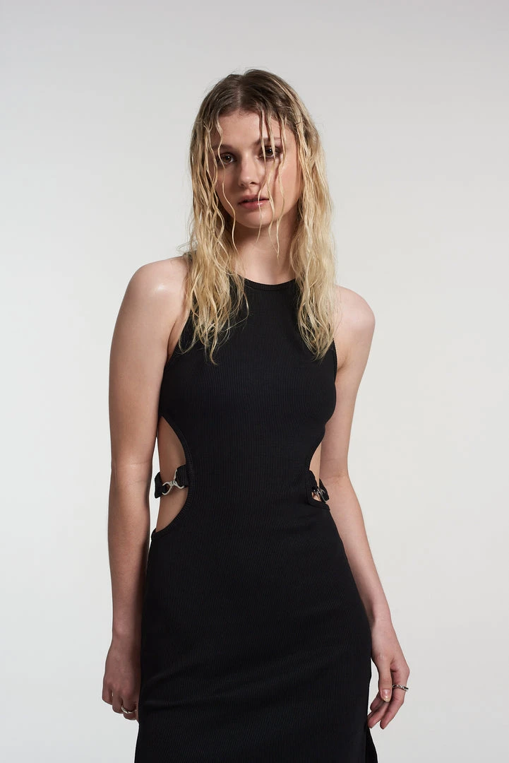 The Ragged Priest black ribbed maxi vest dress with side slits and cut out waist detail with trigger hook strap detail.