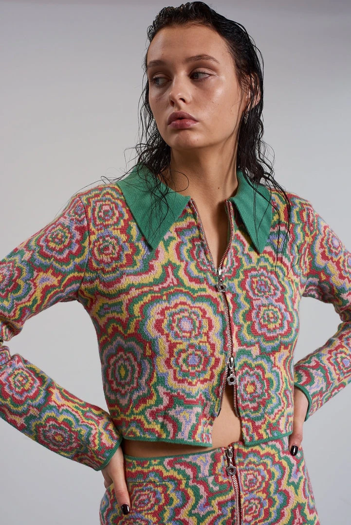 The Ragged Priest multi colour trippy floral jacquard long sleeve knitted top / cardigan with zip front and contrast collar.
