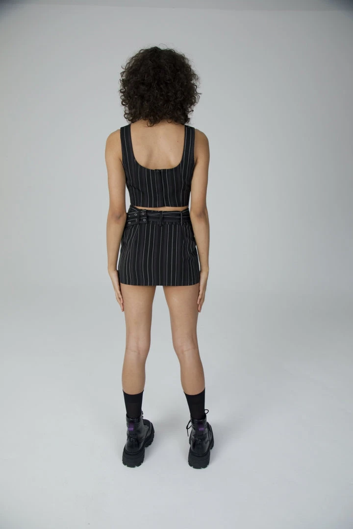 The Ragged Priest black pinstripe mini skirt with double eyelet buckle belt.
