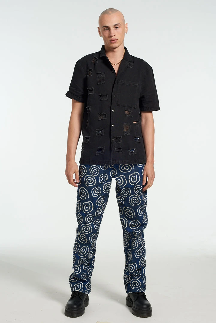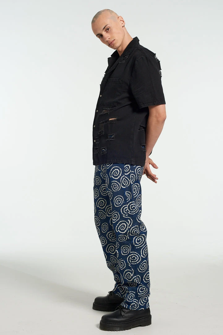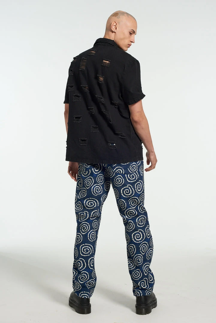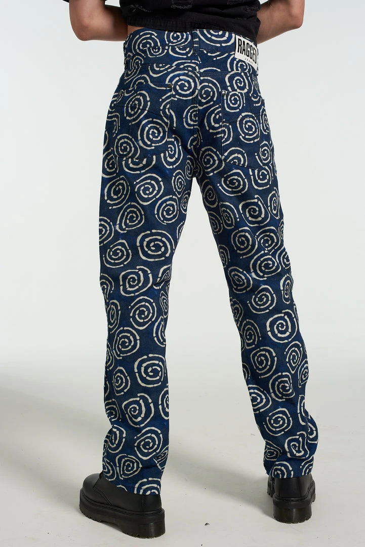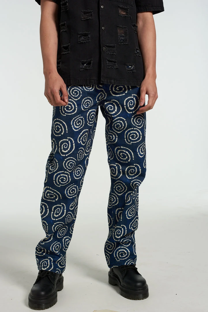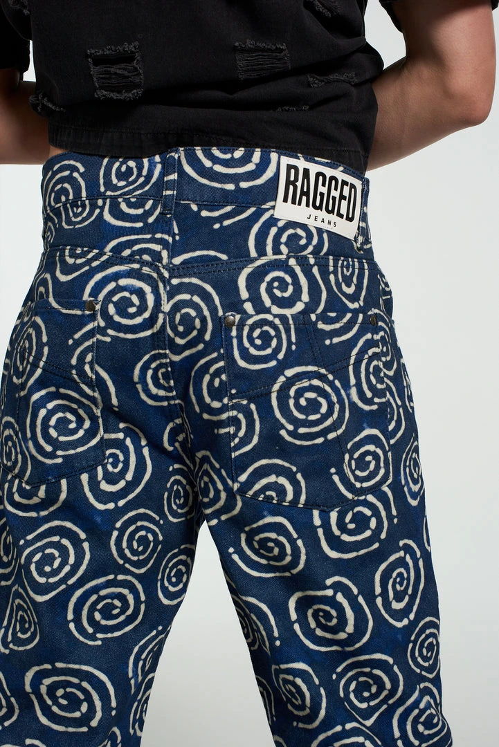 The Ragged Priest men’s Batik inspired swirl print jeans in navy and white.