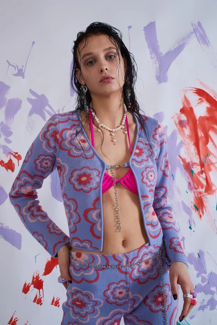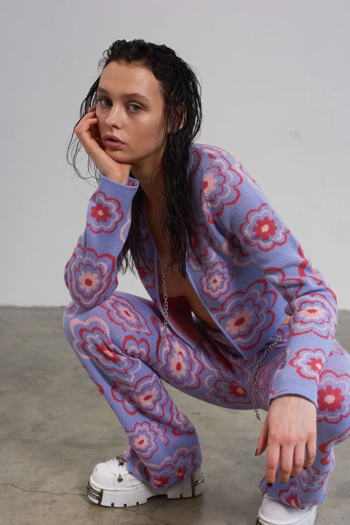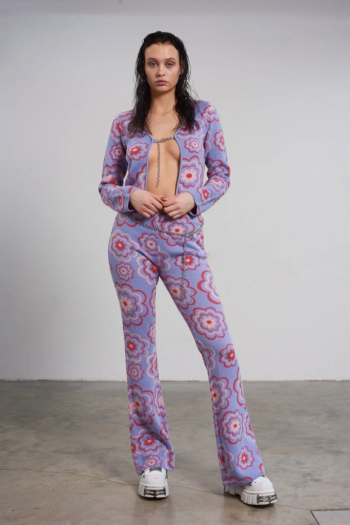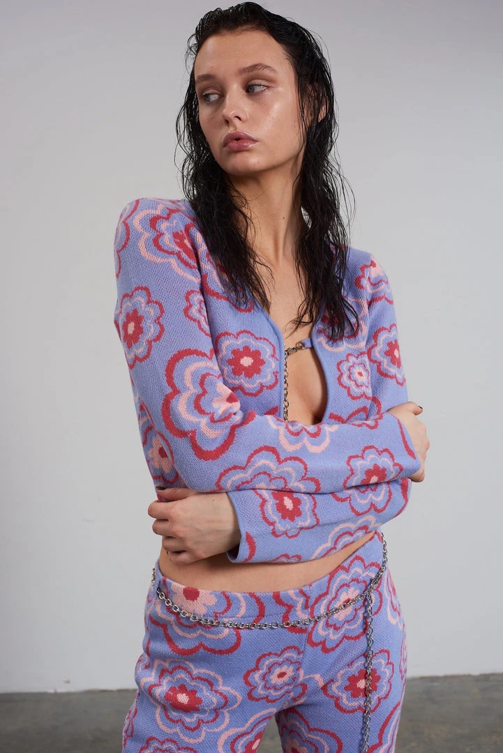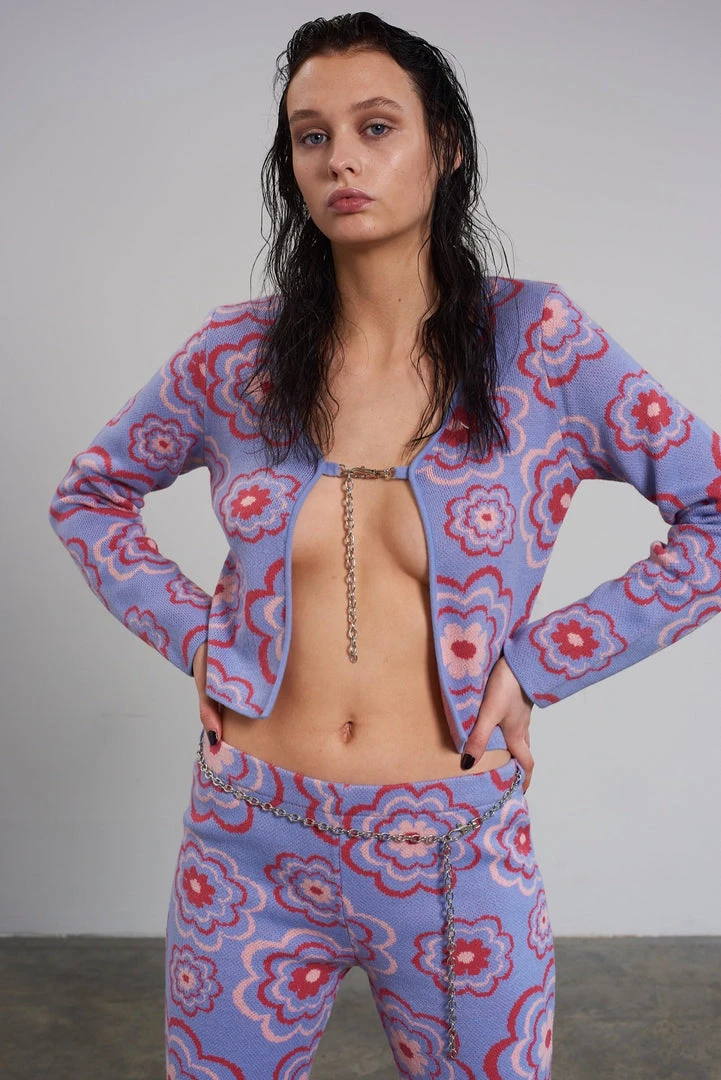 The Ragged Priest purple floral long sleeve knitted top / cardigan with mini bike chain detail.