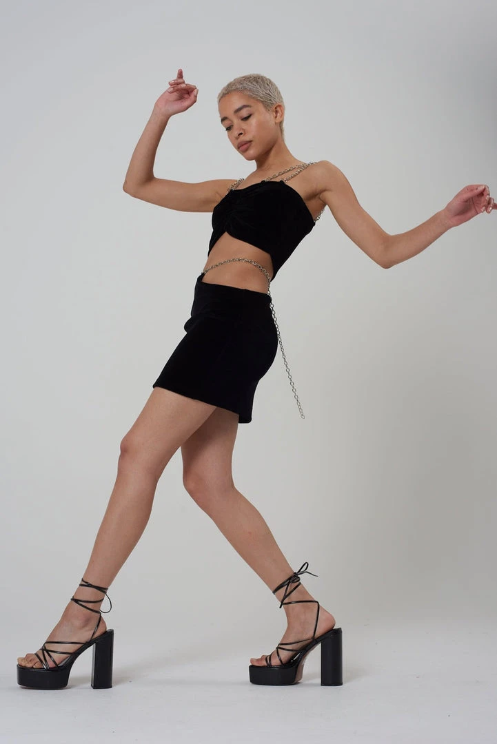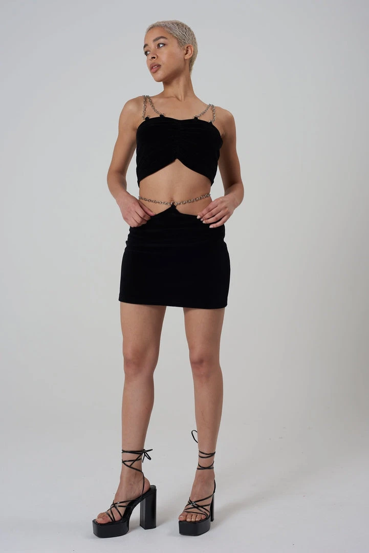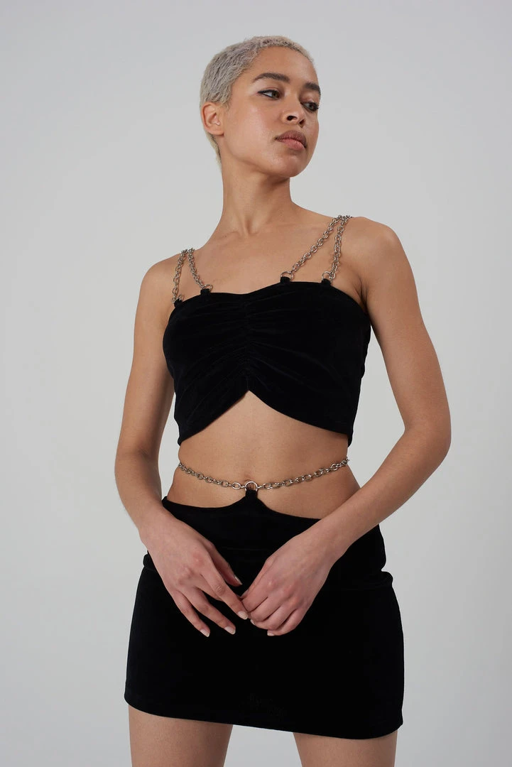 The Ragged Priest black faux velvet top with chain detail.