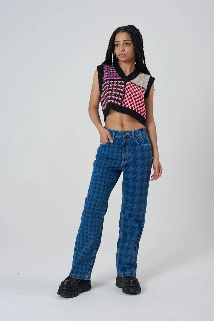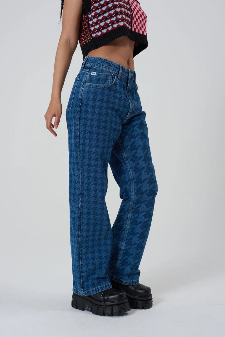 Ragged Jeans houndstooth laser print blue denim dad jean.