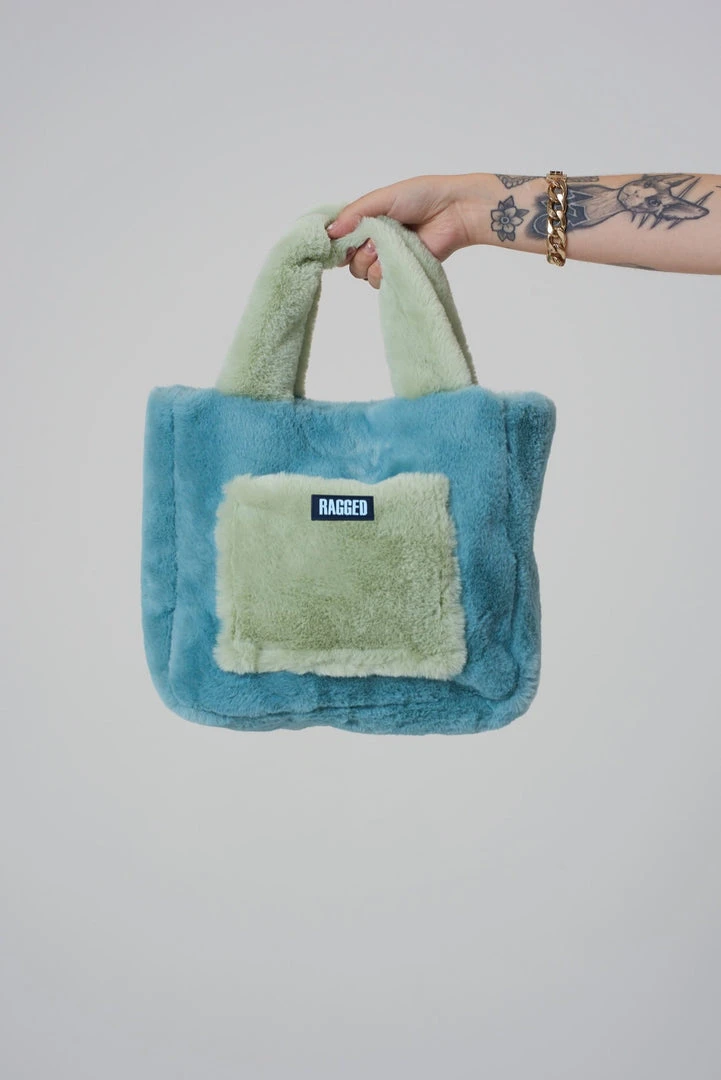 Ragged Jeans green & blue teddy mini box grab bag with black “RAGGED” tab on the front.