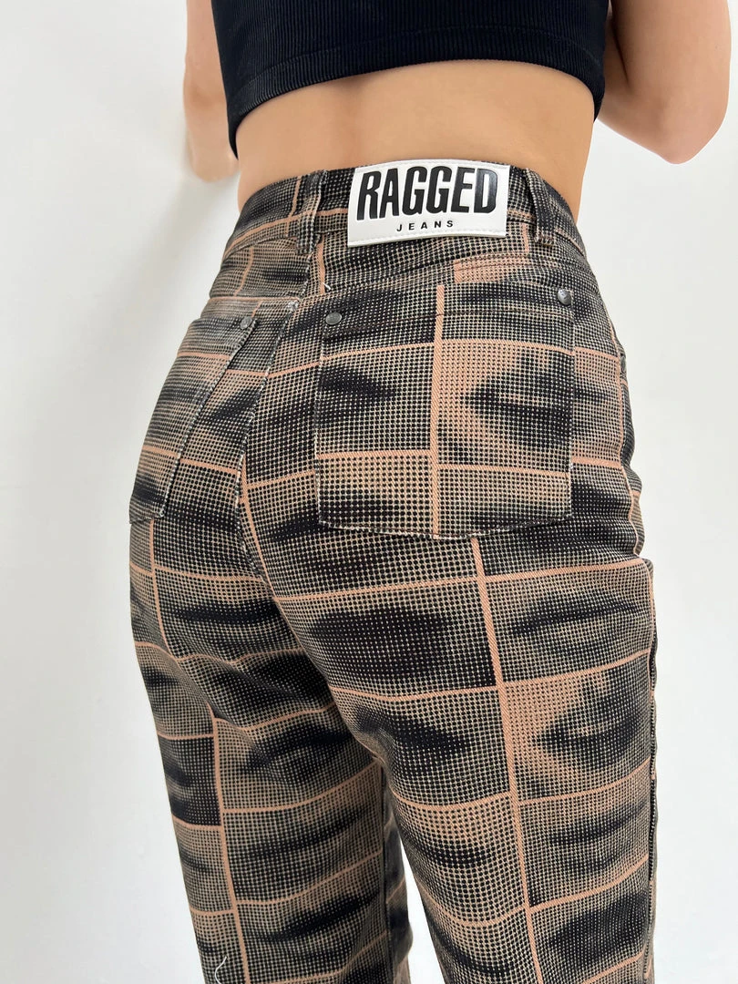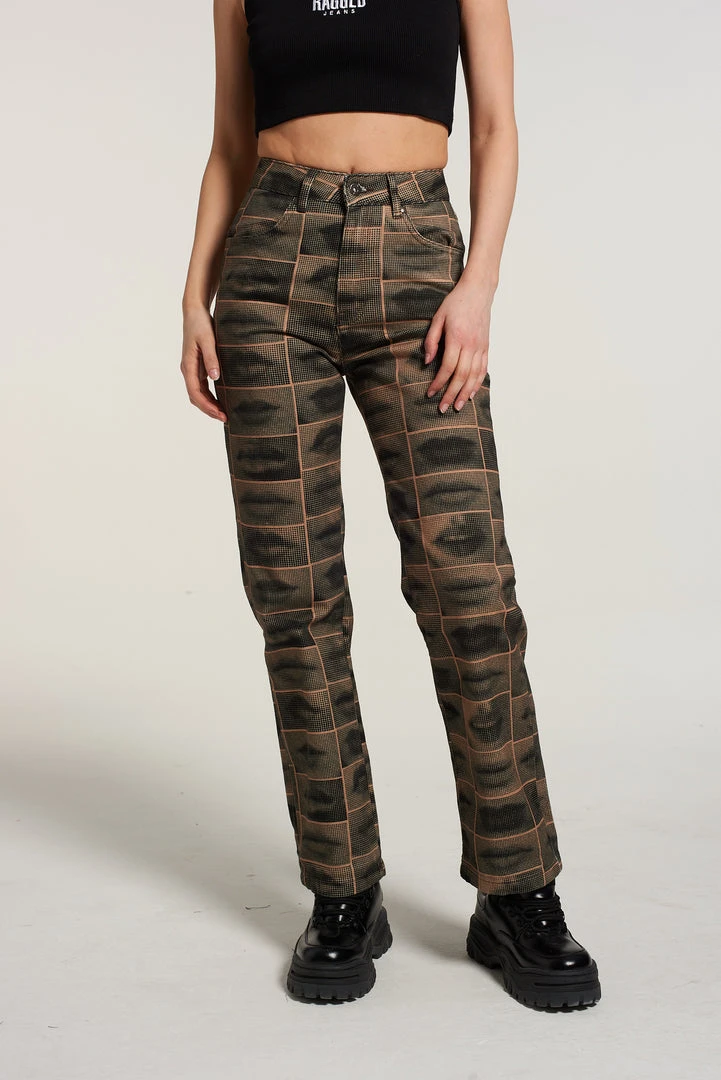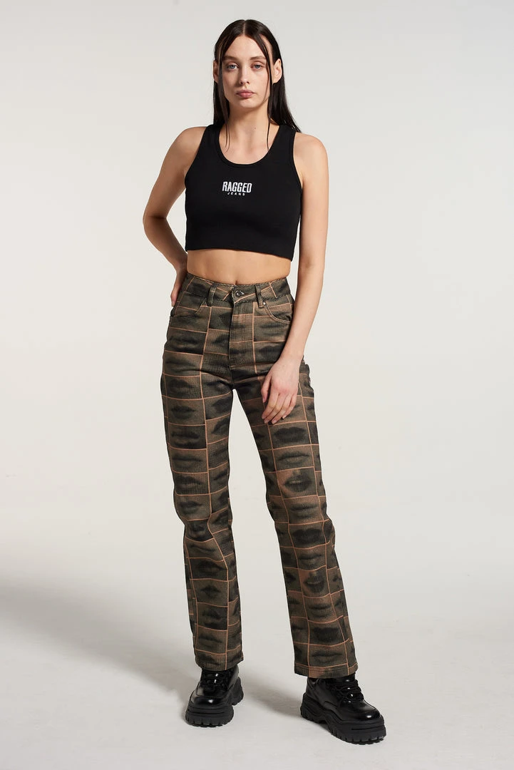 The Ragged Priest black & brown all over lip graphic print pants.