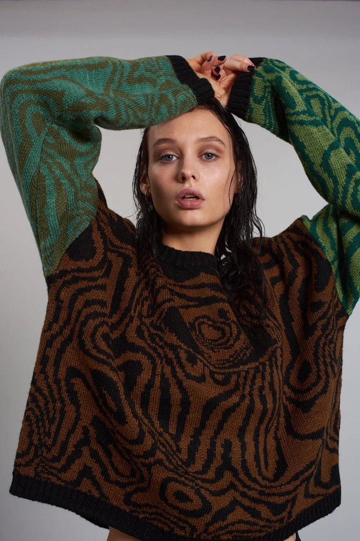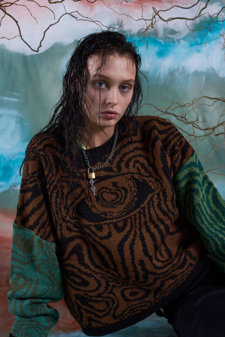 The Ragged Priest brown marble pattern knitted jumper with eye graphic and green contrast sleeves.