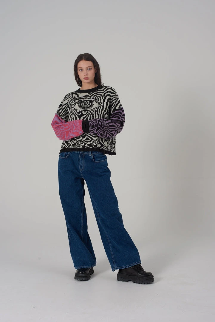 The Ragged Priest black & white marble pattern knitted jumper with eye graphic and contrast sleeves.
