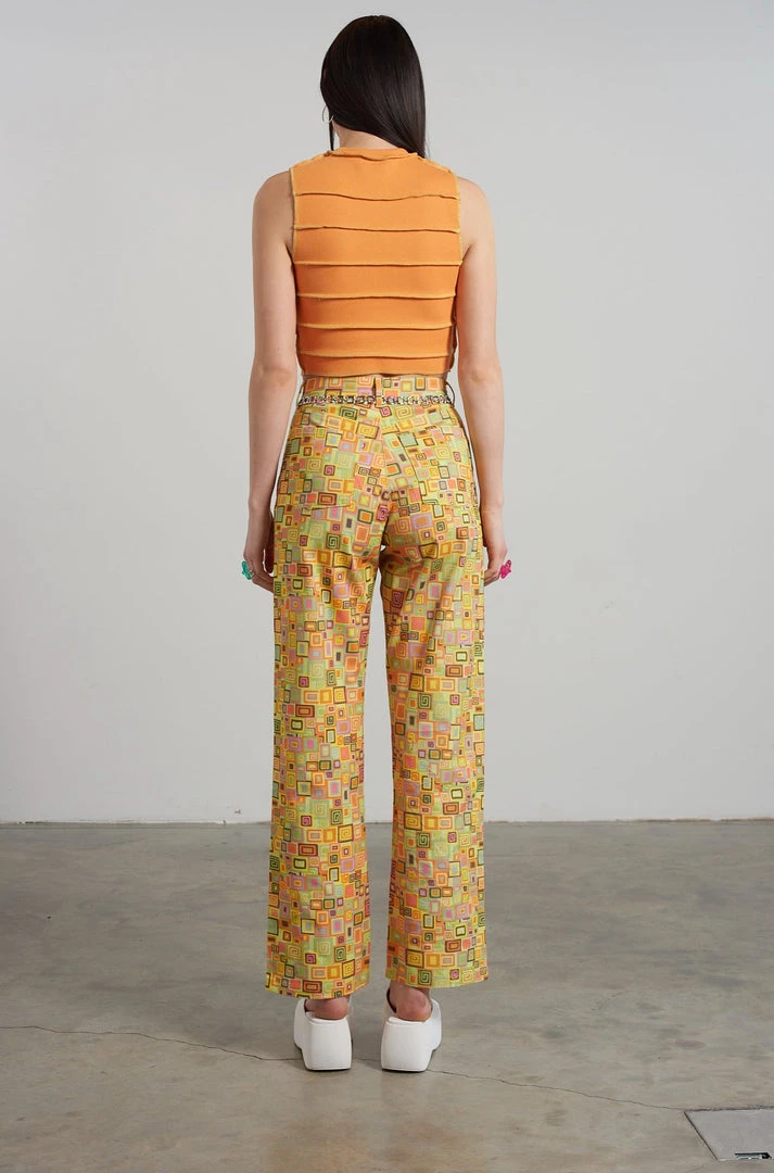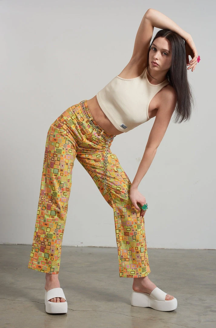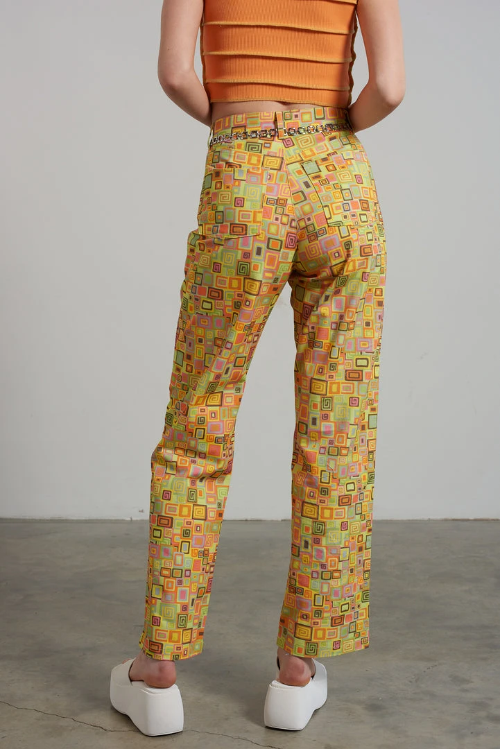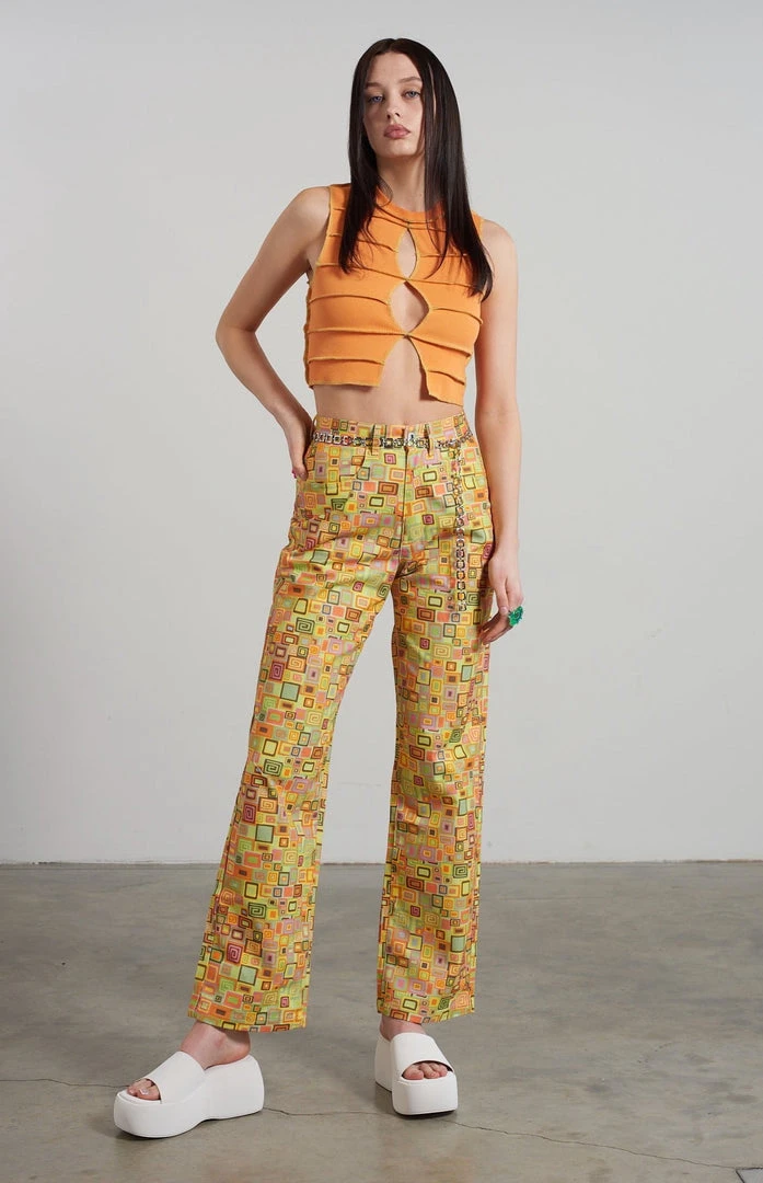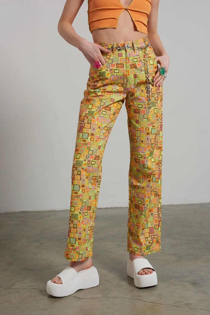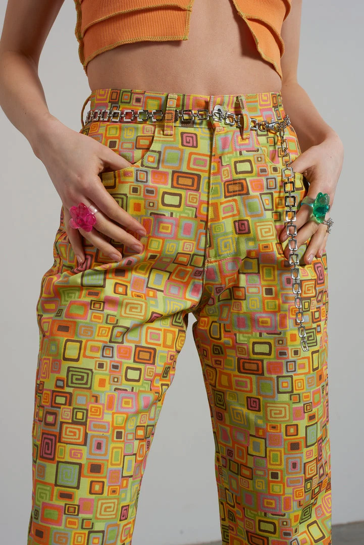 The Ragged Priest retro patterned straight leg pant with chain belt.