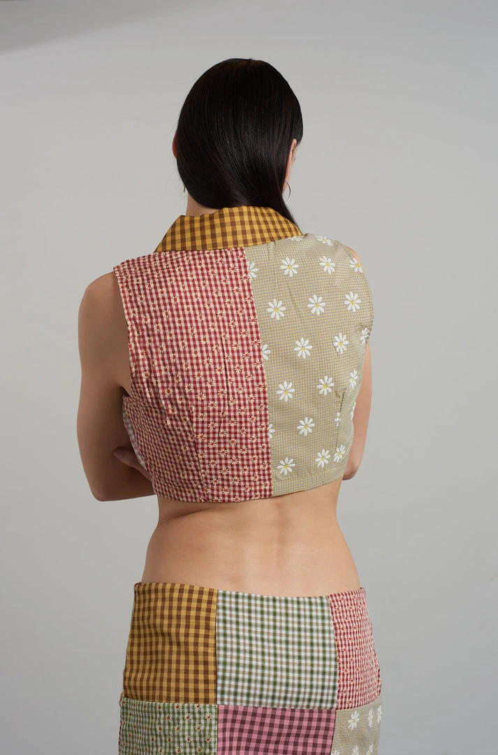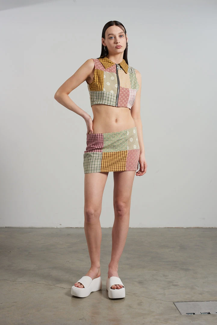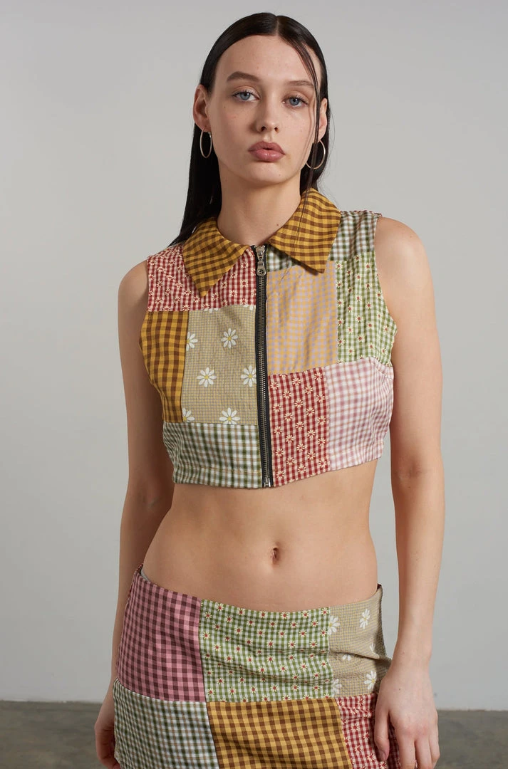 The Ragged Priest multi coloured mixed patchwork sleeveless zip up cropped shirt.