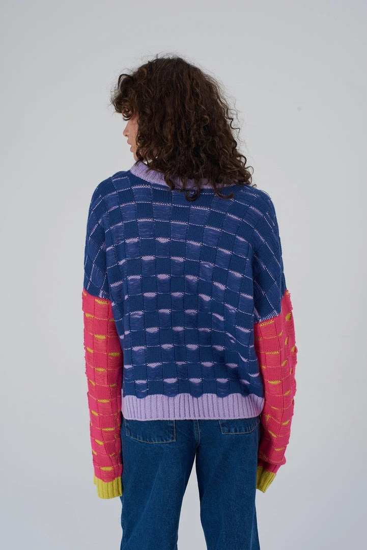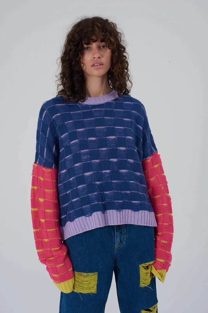 Ragged Jeans purple laddered checkerboard knit jumper.