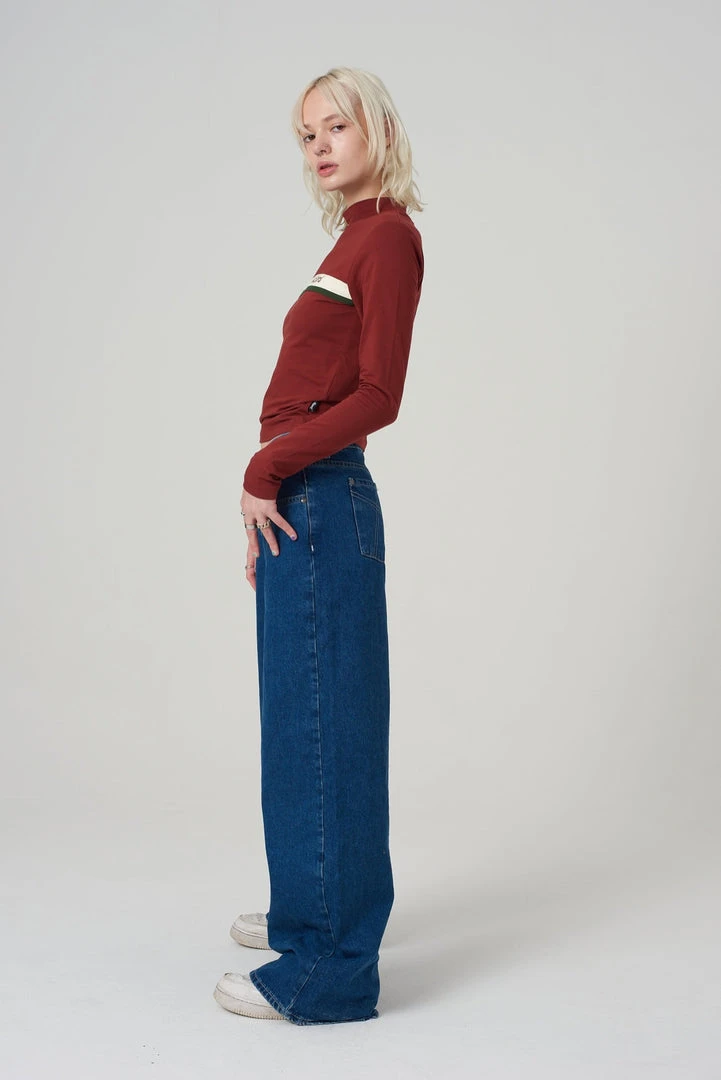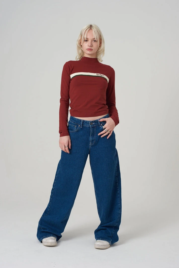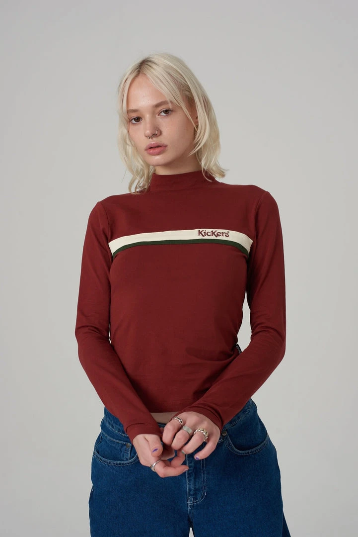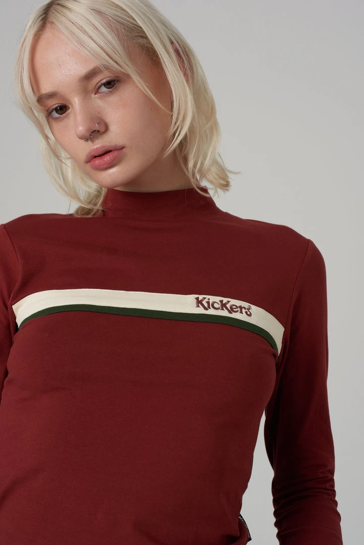 Kickers Classics rust high neck long sleeve top with chest stripe.