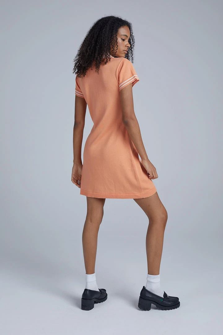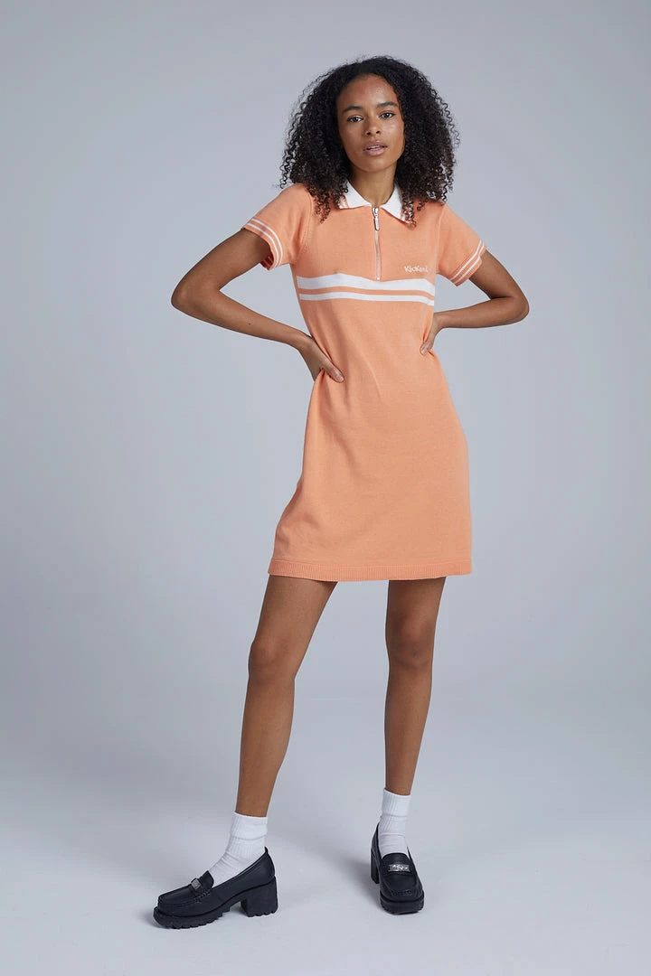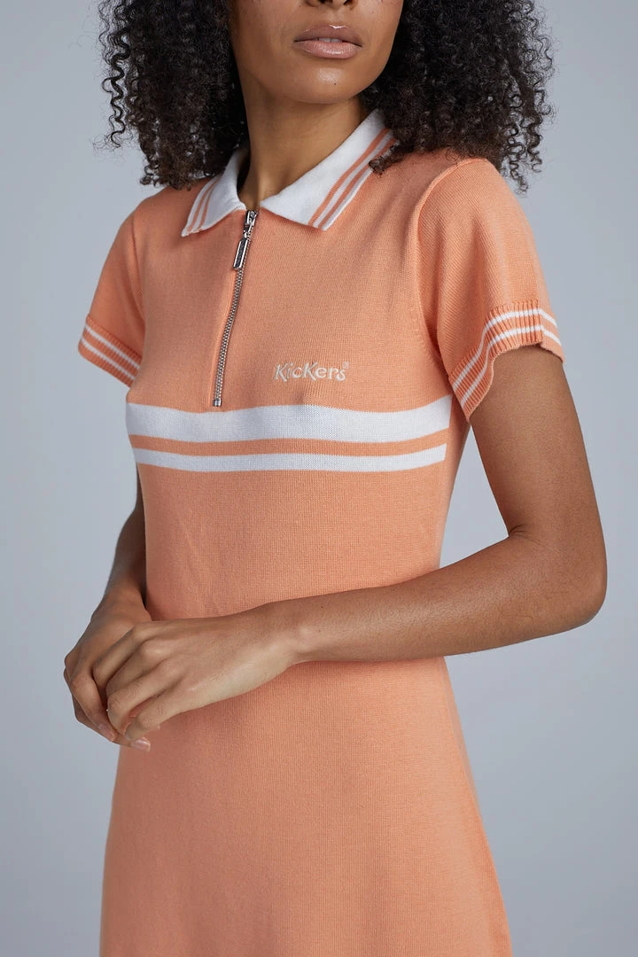 Kickers Classics coral polo dress with chest stipe and embroidered “Kickers” logo.