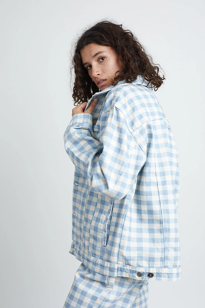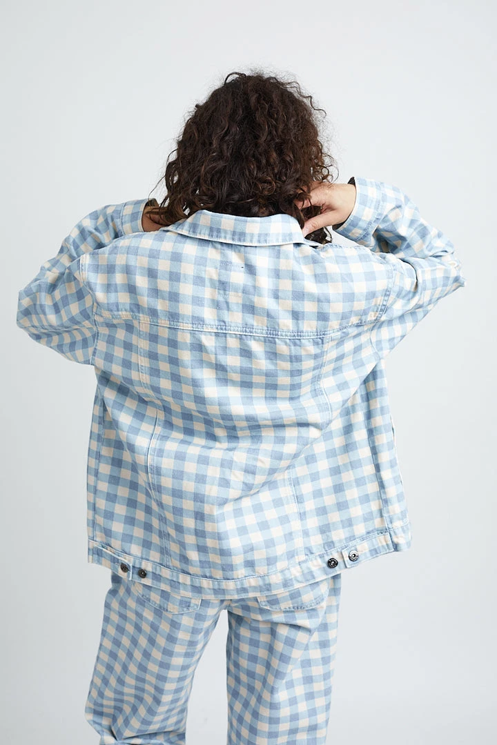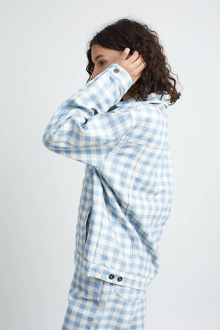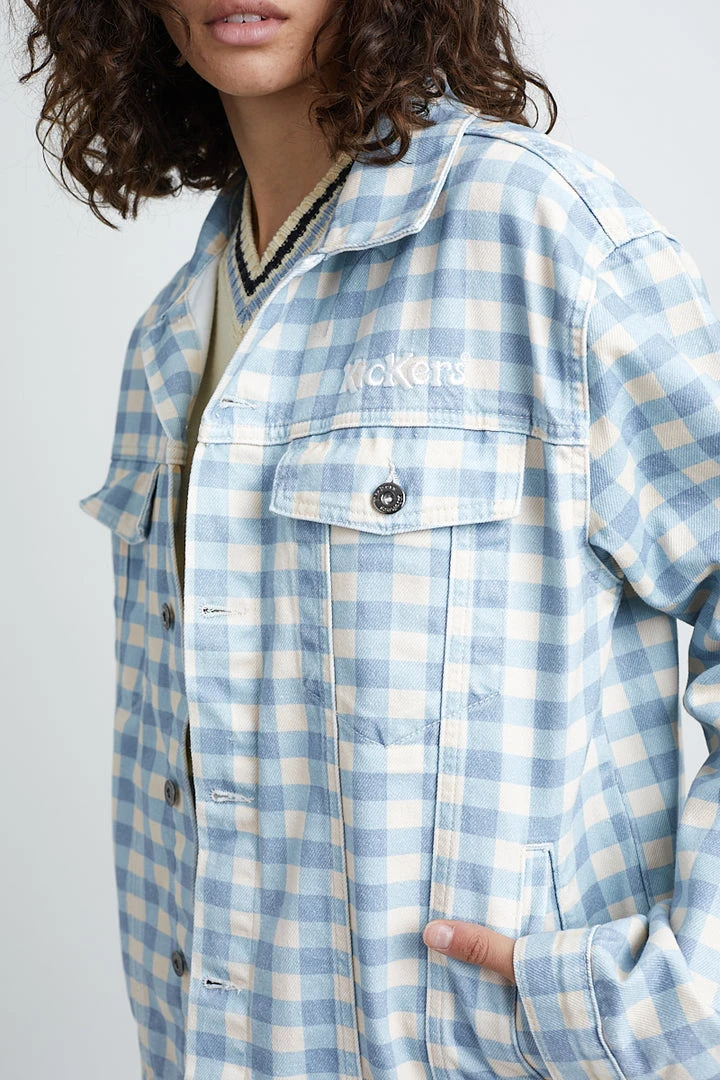 Kickers Classics gingham classic denim jacket with button up front and small kickers embroidered logo.