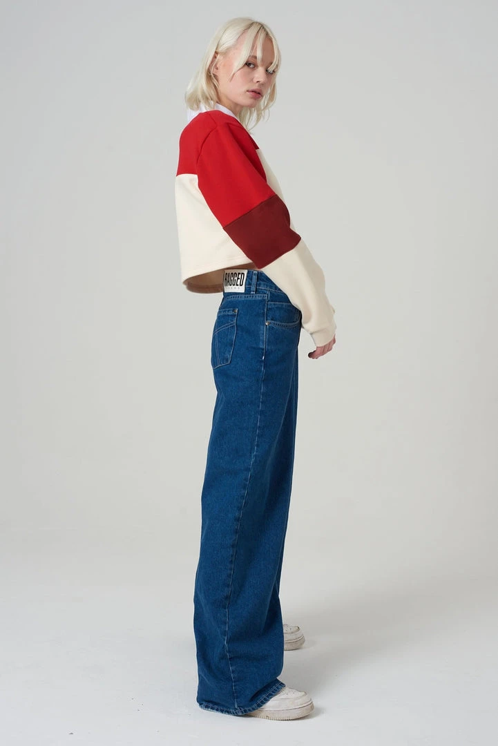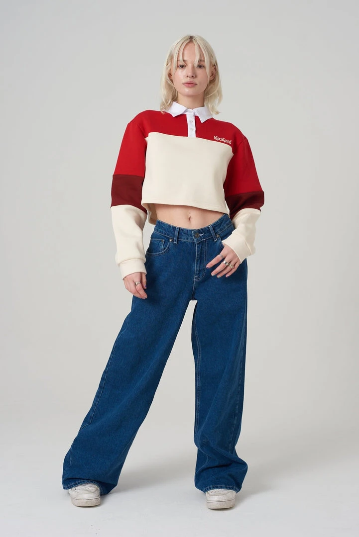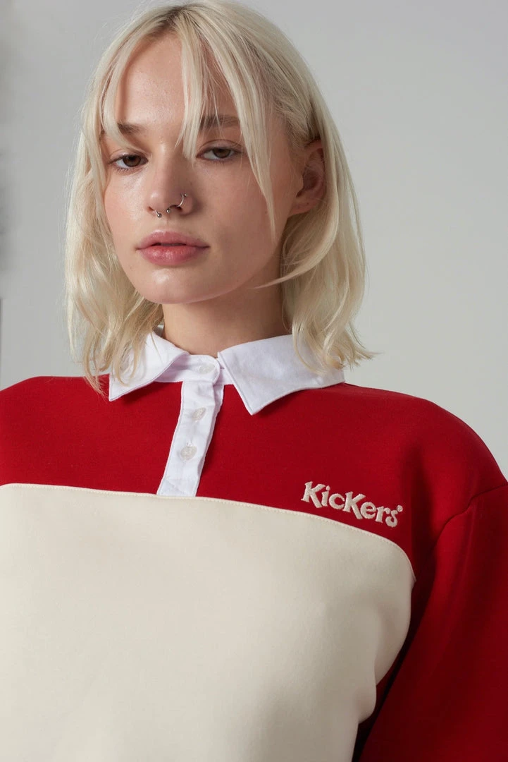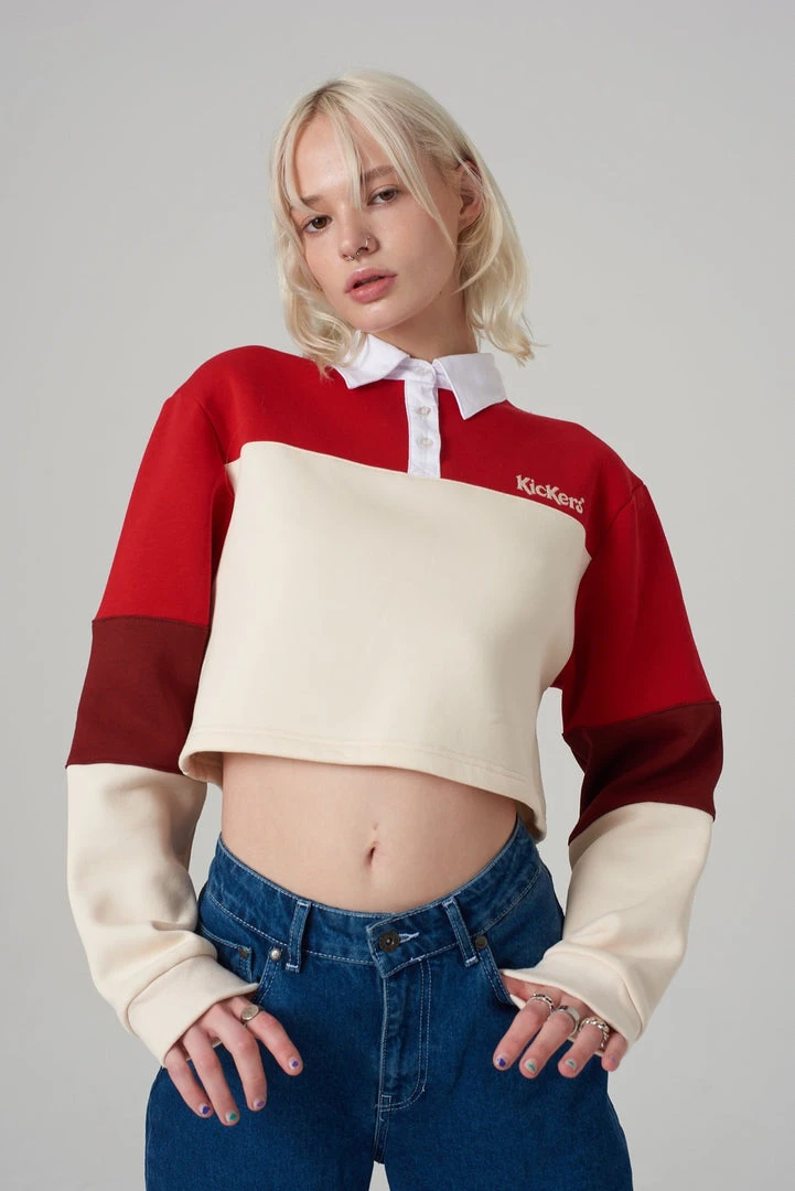 Kickers Classics red & cream long sleeve cropped rugby top.