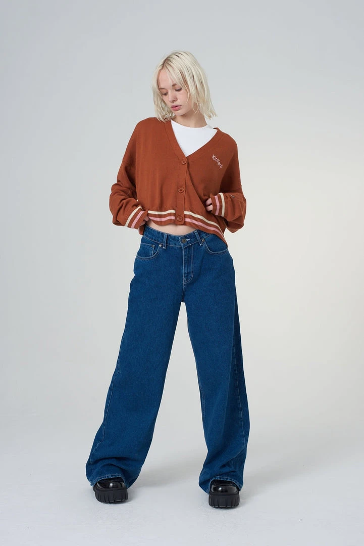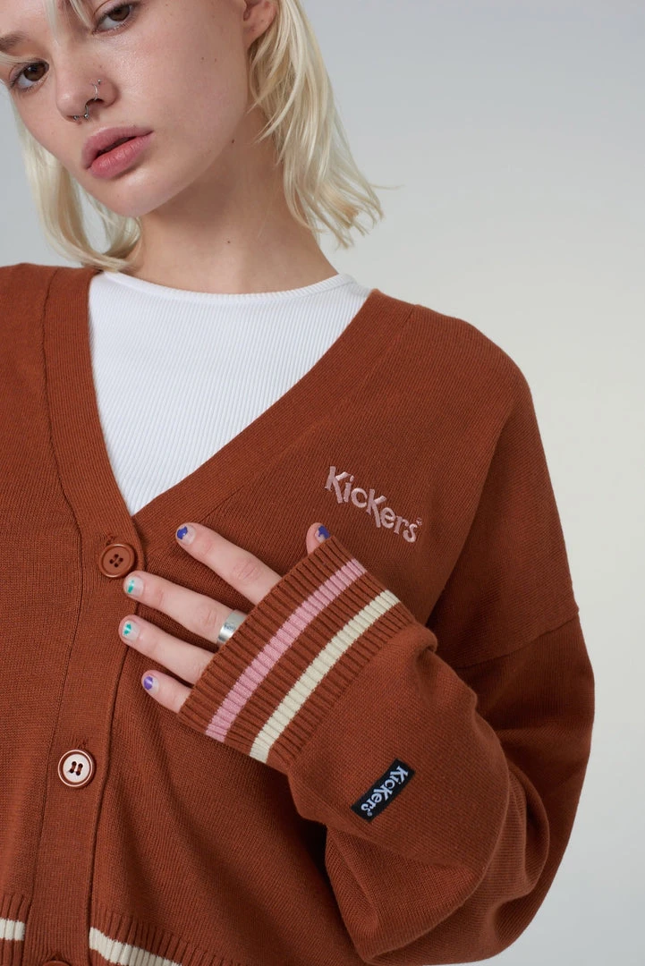 Kickers Classics rust cardigan with pink and beige stripe trim.