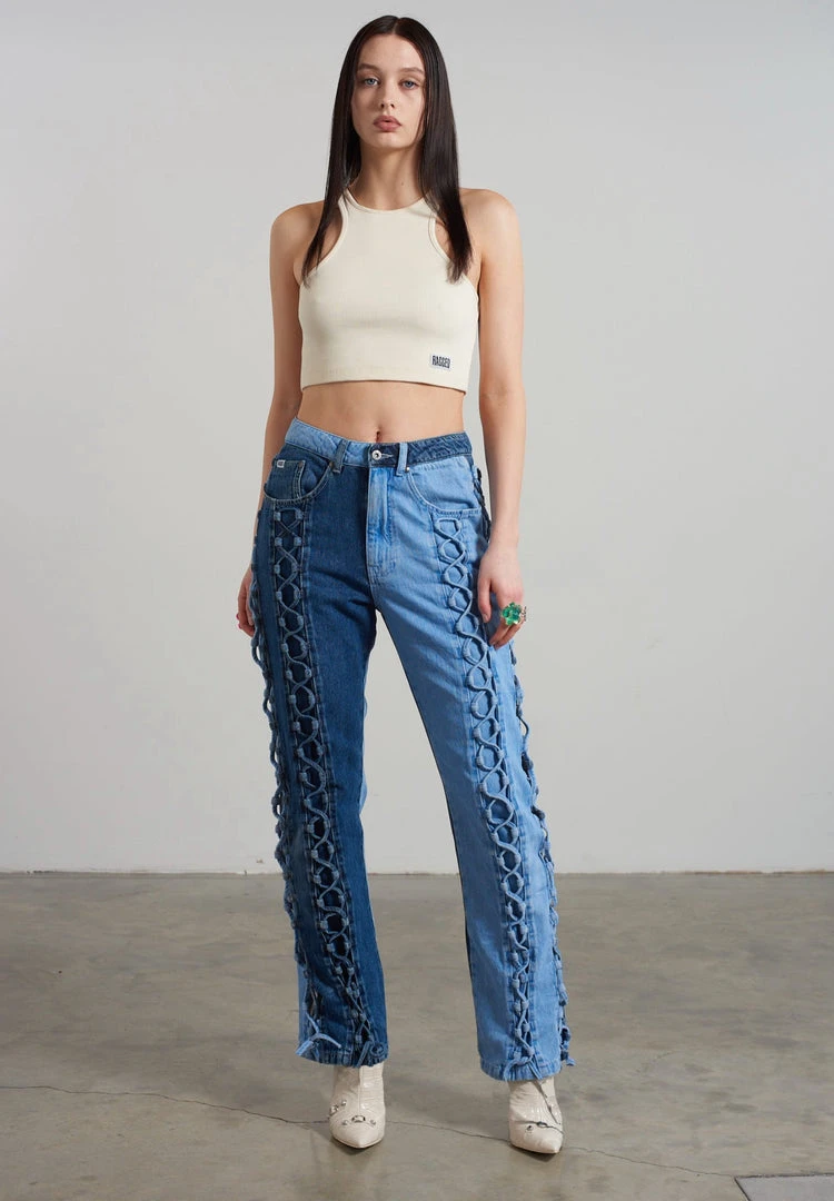 Ragged Jeans half and half blue denim dad jean with lace-up detail.