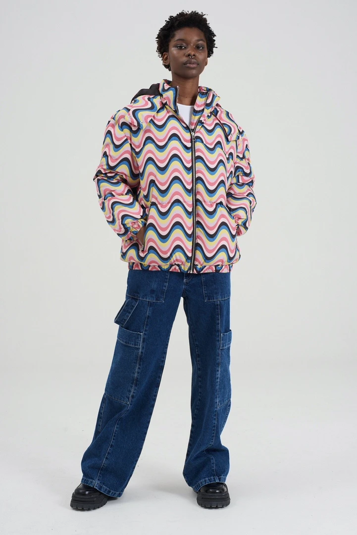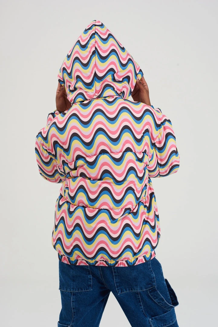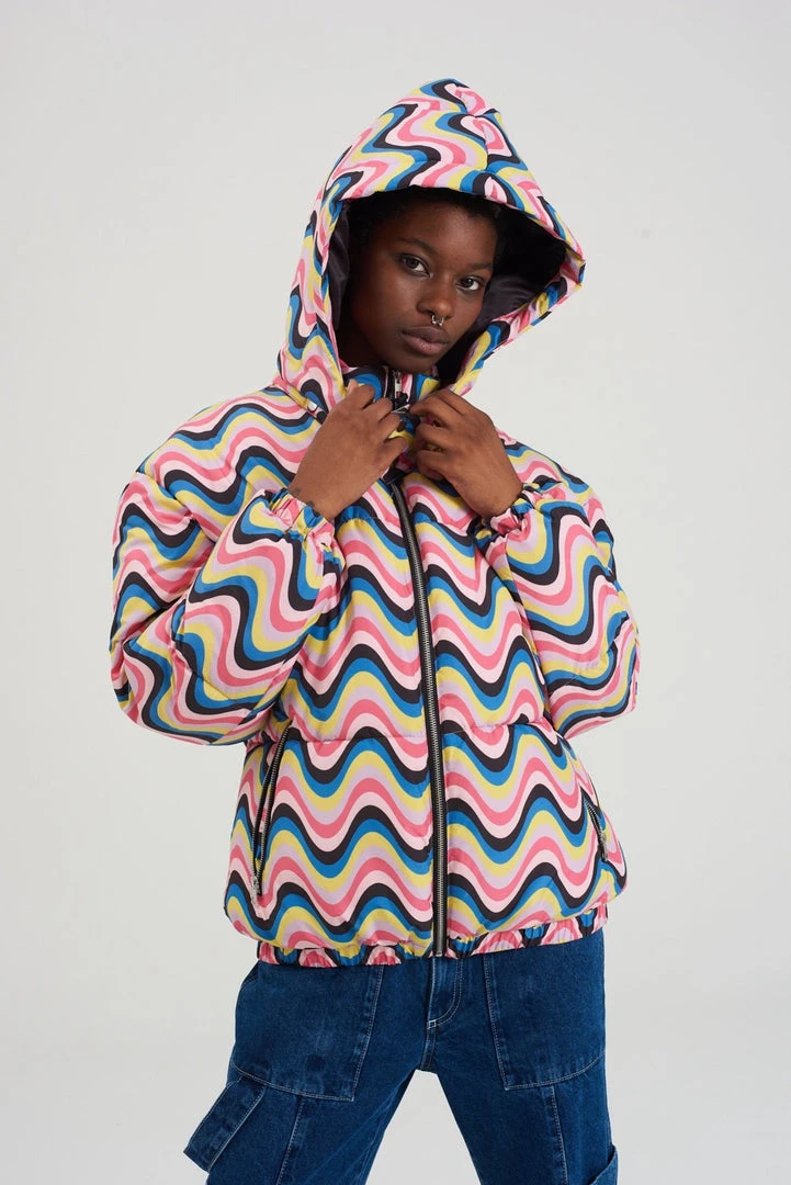 Ragged Jeans multicolour wave pattern printed puffer coat with hood.