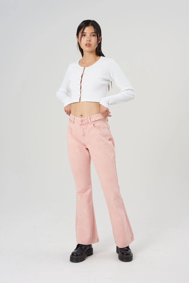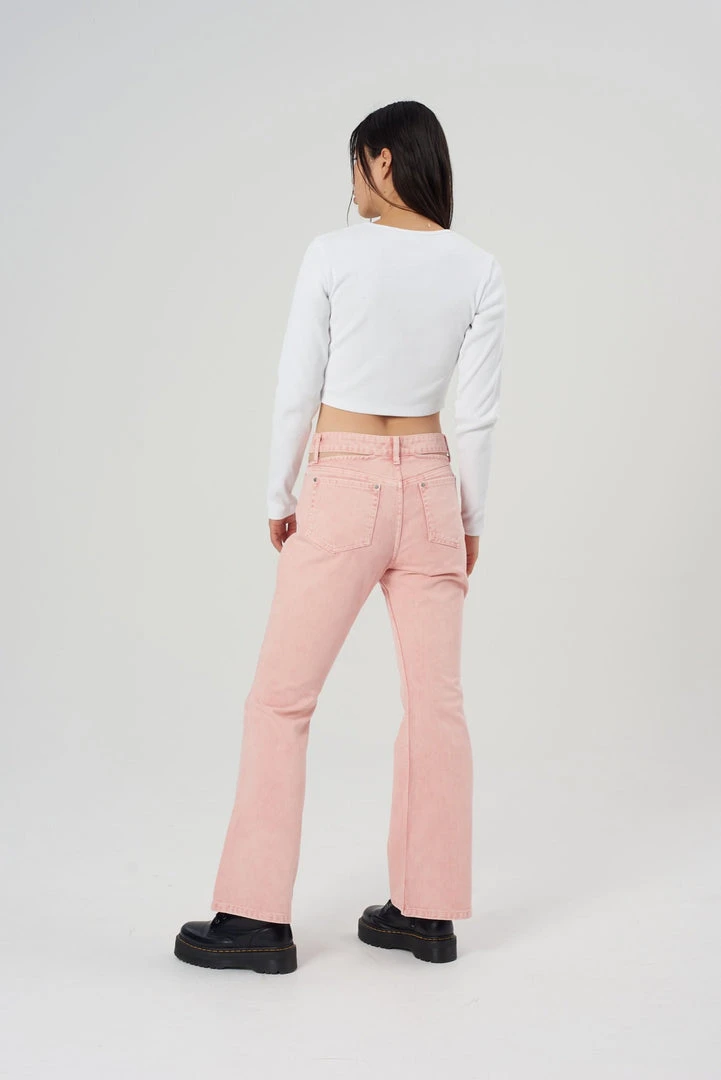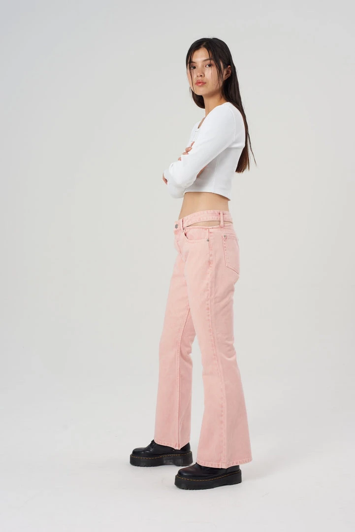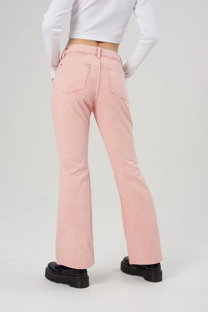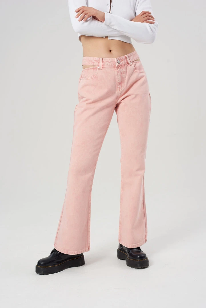 The Baby Jeans are our pink denim flared jeans with waist cut out detail. Crafted from 50% recycled cotton.