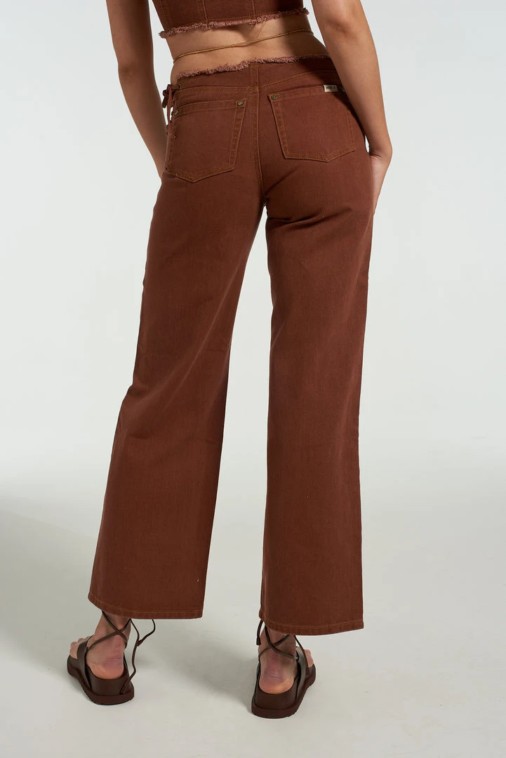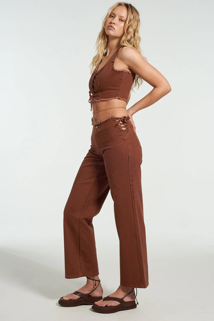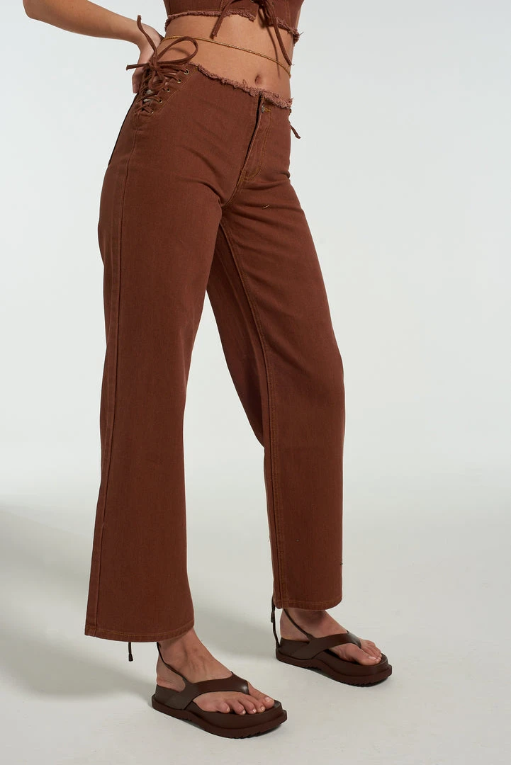 The Earth jeans are our brown low rise, straight leg jeans with lace up side waist detail and raw hem frayed waistband.