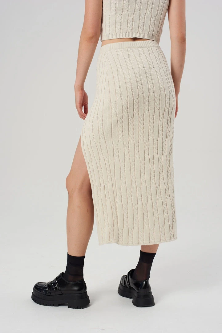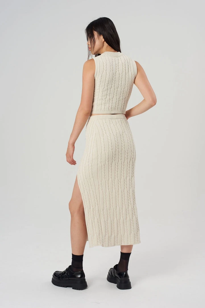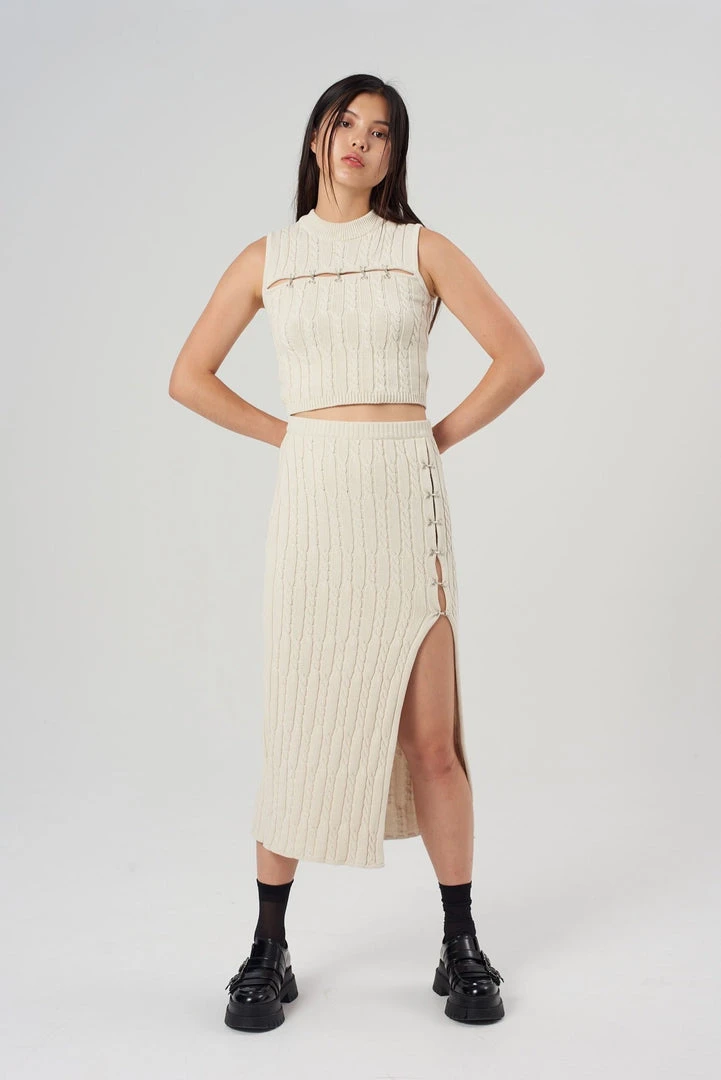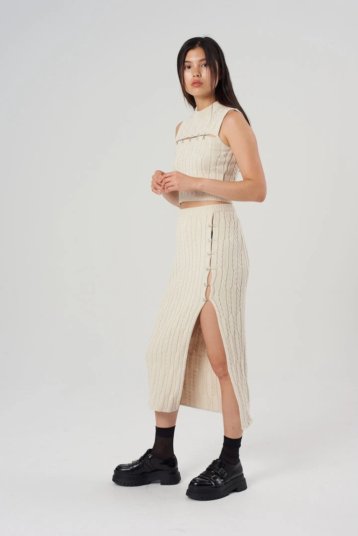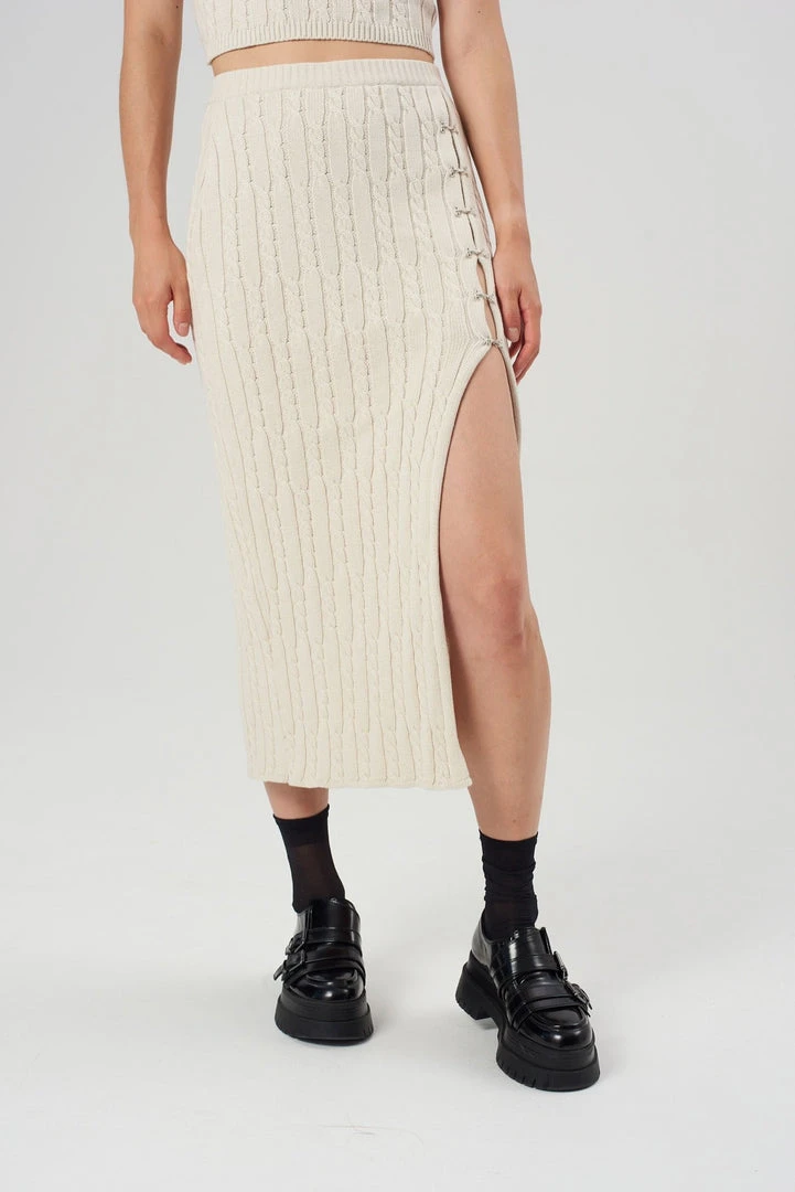 The Eclipse Skirt is our beige cable knit midi length skirt with safety pin detail.