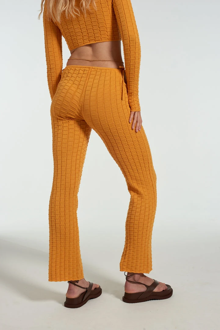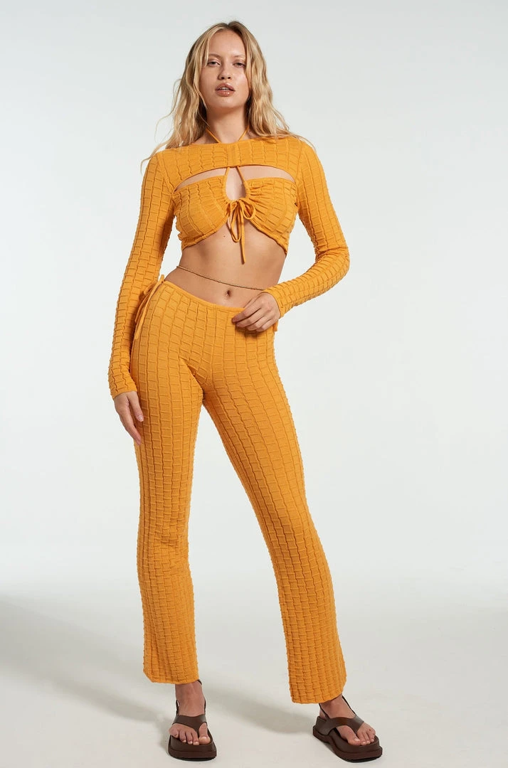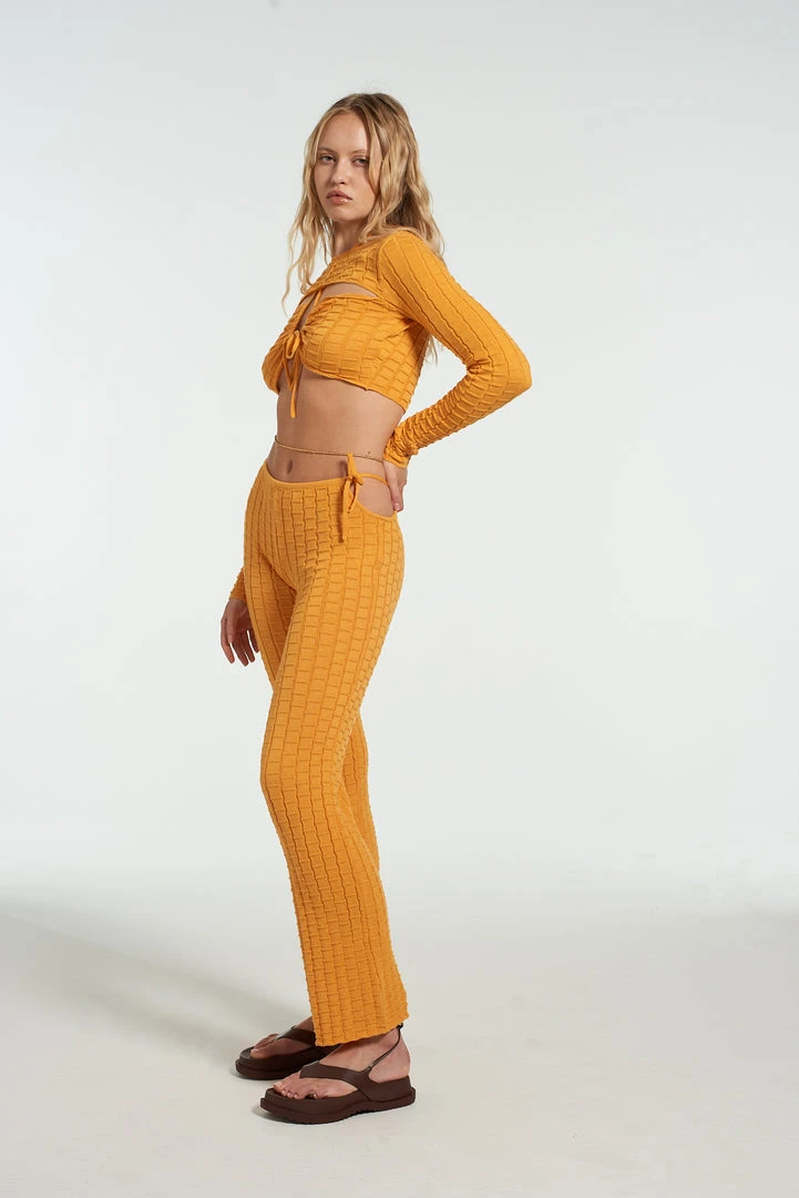 The Frontier knitted pants are our orange textured knitted trousers with side cut out and tie up detail.