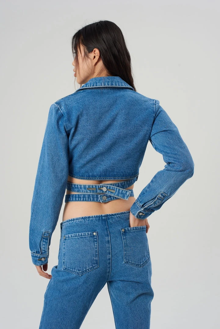 The Halo Top is our wrap around blue denim shirt. Crafted from viscose, polyester, and recycled cotton.