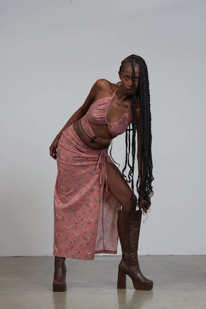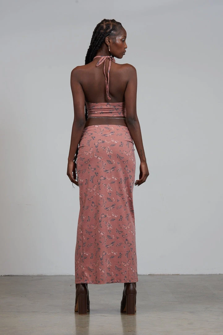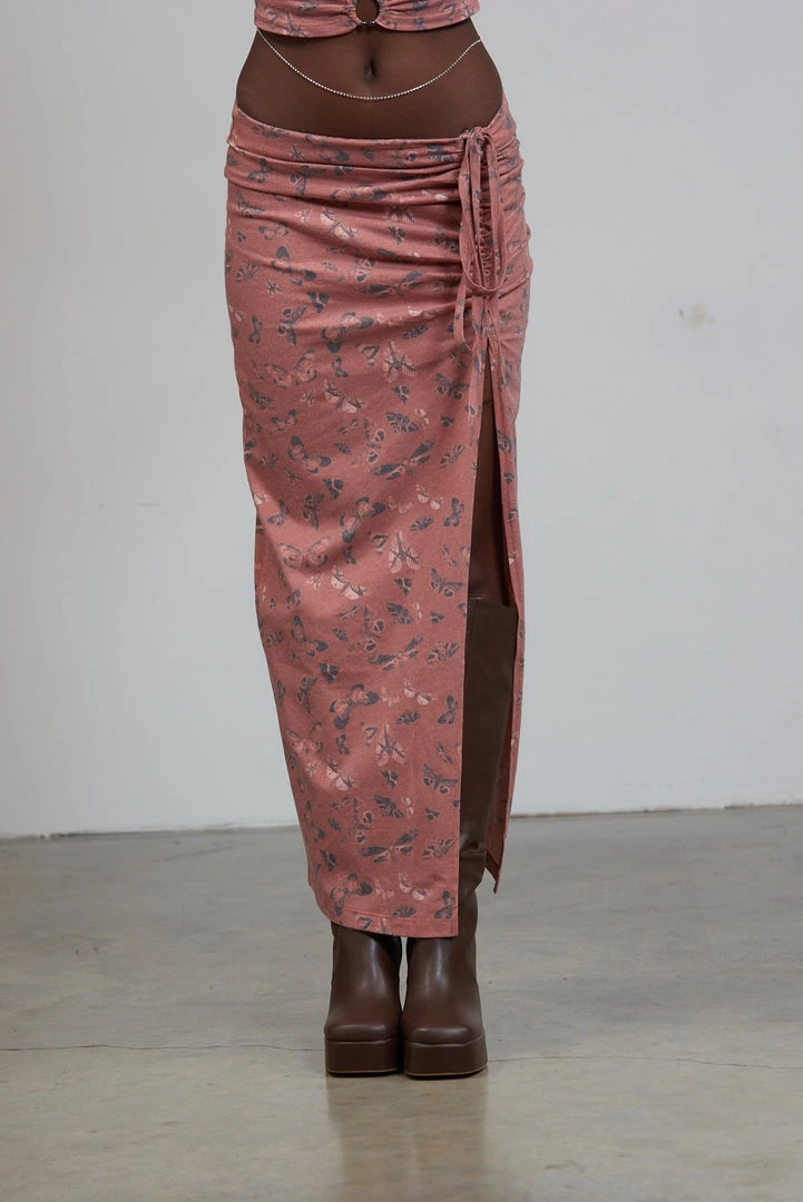 The Metamorph Skirt is our burnt orange maxi skirt with all over moth and butterfly print. Crafted from ethically sourced cotton, this skirt features a side split detail, tie up detailing and front ruching.