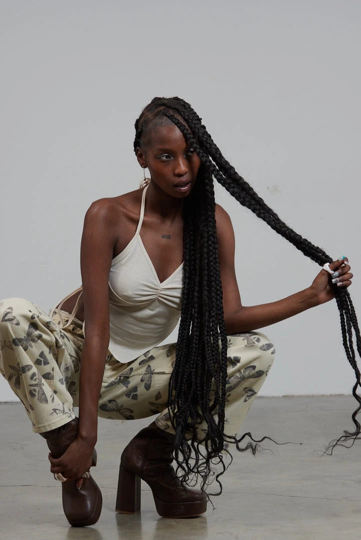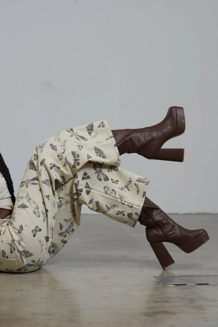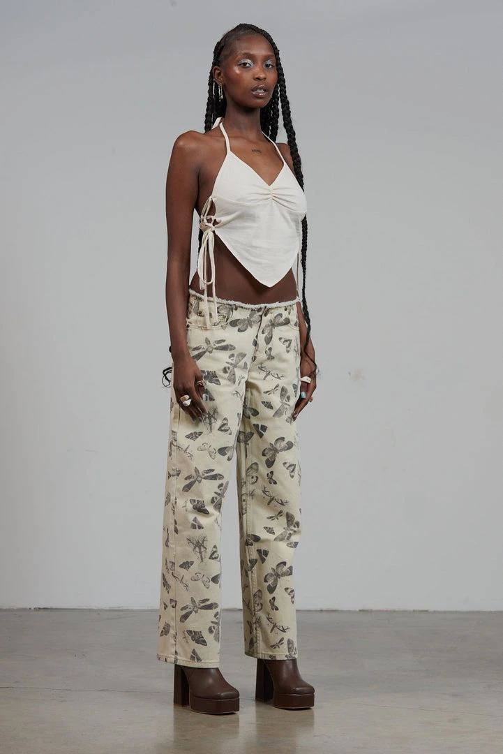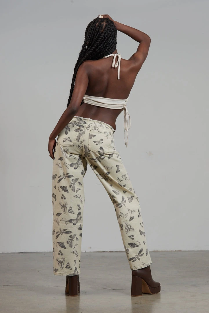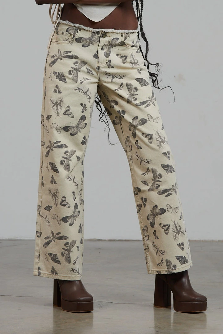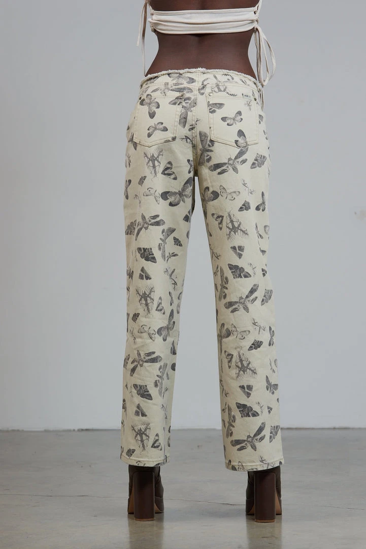 The Moth Jeans are our ecru denim low rise relaxed fit jeans with a statement moth and butterfly print. Crafted from 50% recycled cotton these pants feature a frayed hem and are designed to be worn on the hip.