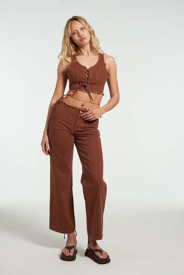 The Native top is our brown panelled corset style crop top with lace up central fastening detail.