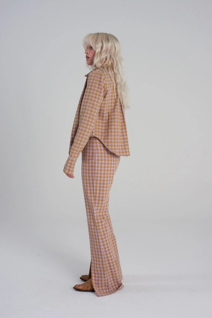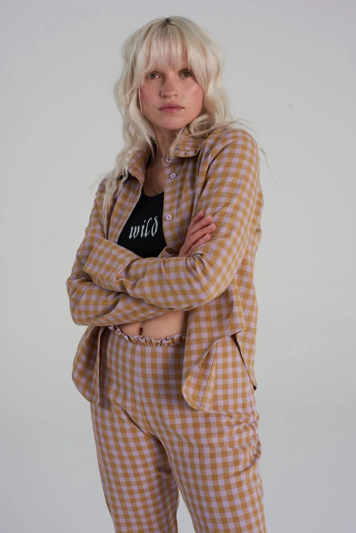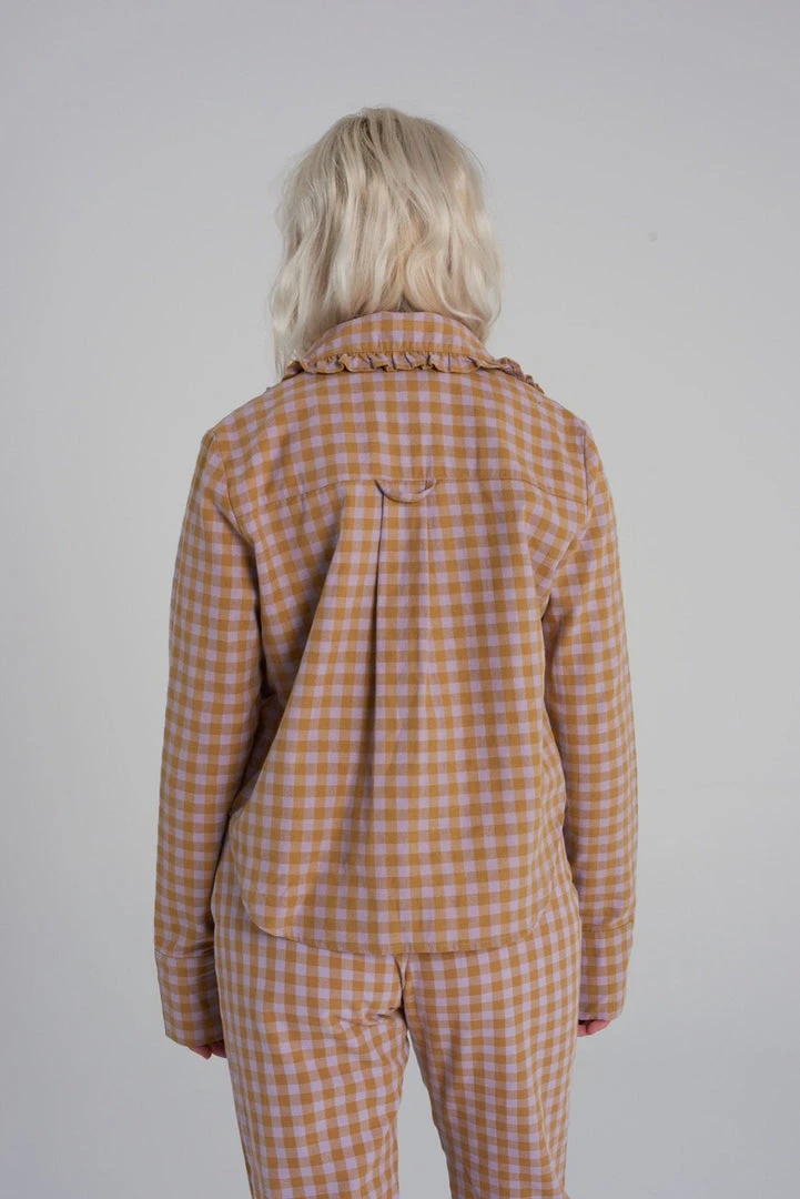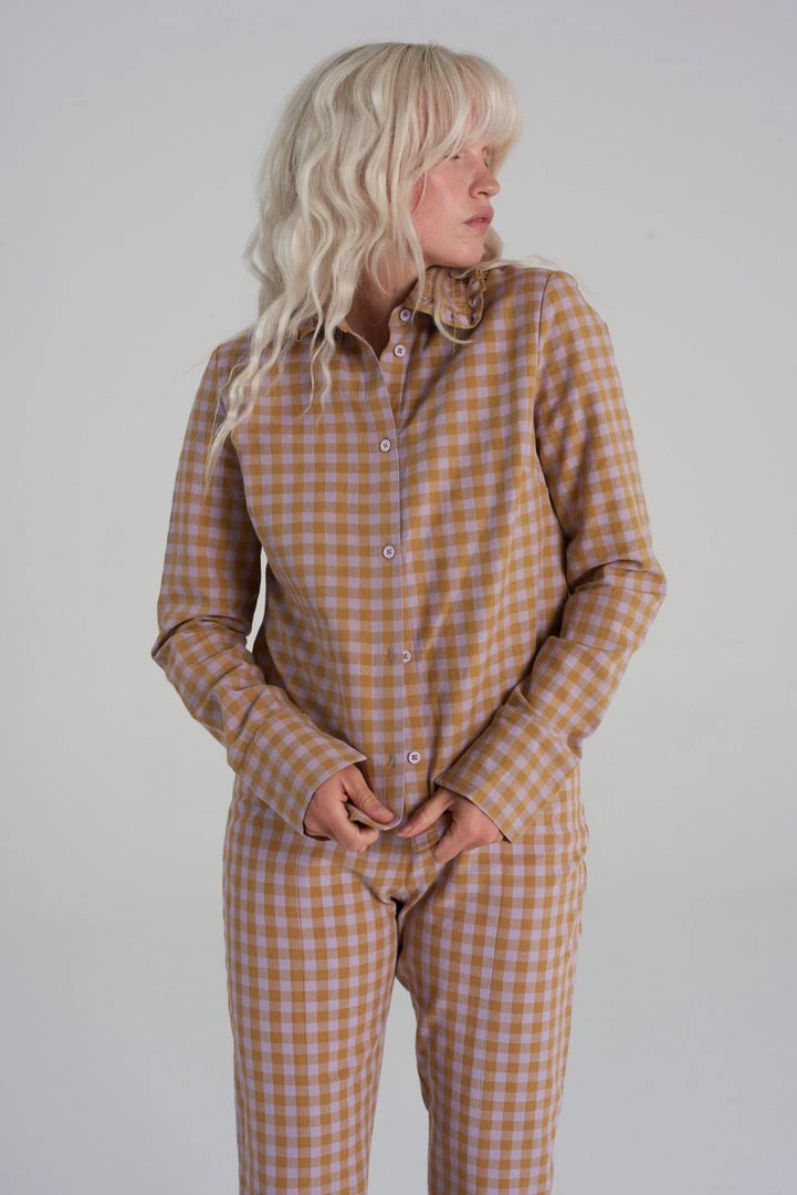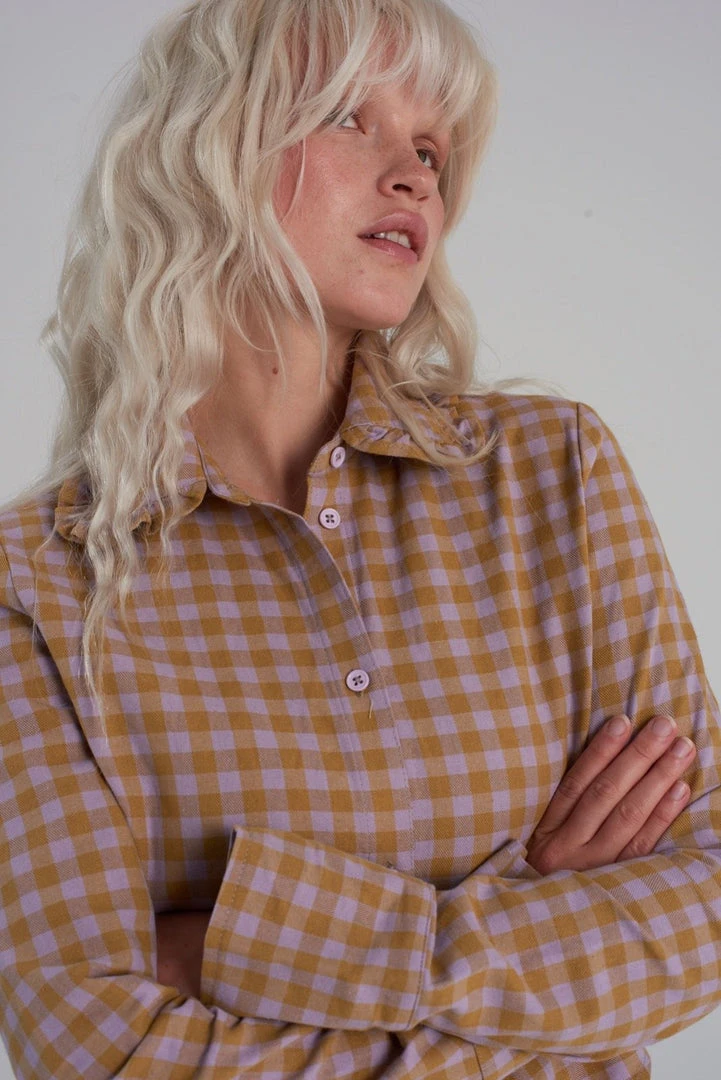 The Nebraska Shirt is our lilac and gold check shirt. Crafted from 100% cotton, this shirt features long cuffs and frill collar trim.