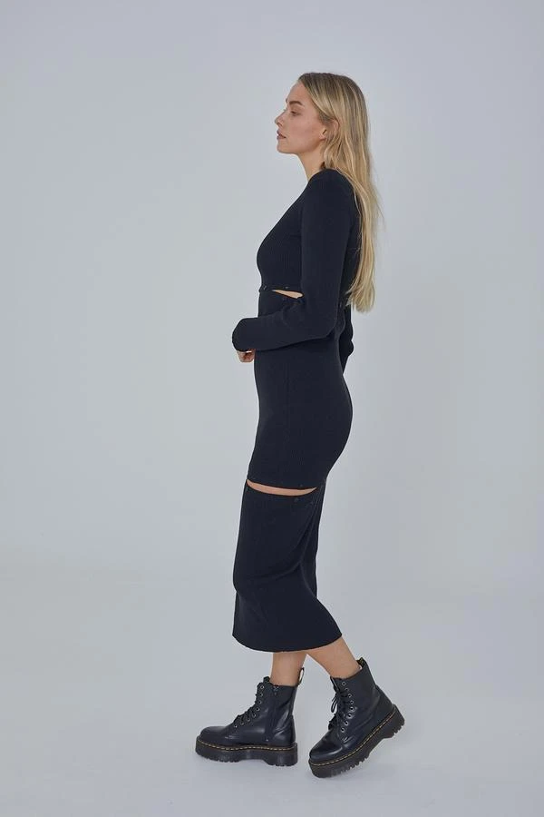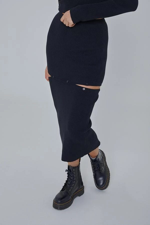 The Opal skirt is our recycled black ribbed midi skirt. Crafted from recycled polyester and cotton, this midi skirt features a cut out detail with button attaching panel. Â