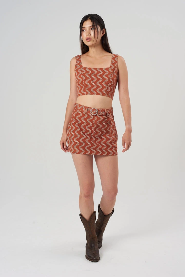 The Reach Skirt is our rust wiggle print mini skirt with circle buckle belt detail.Â