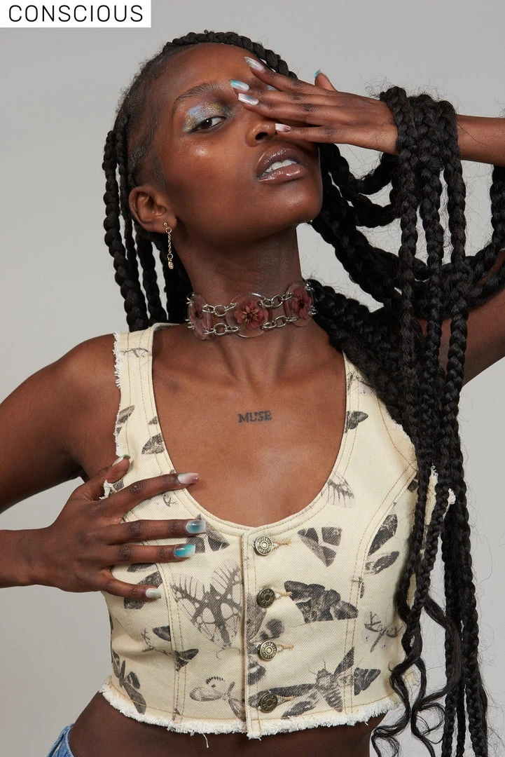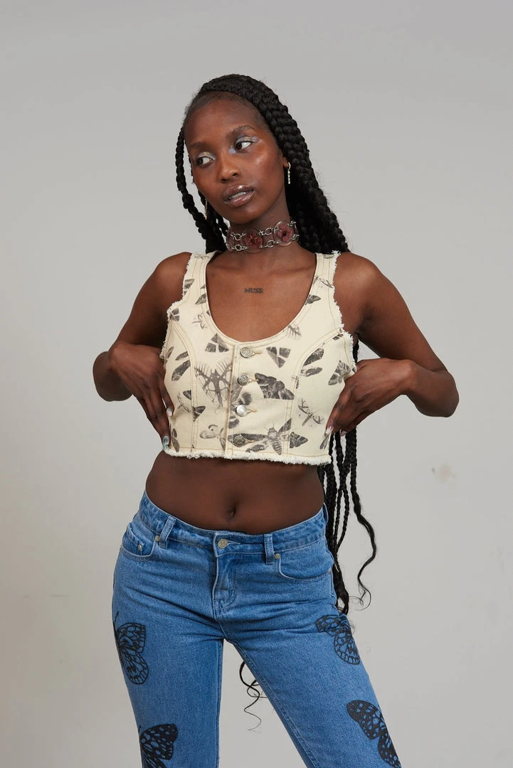 The Wing Top is our ecru denim waistcoat style crop top with a statement moth and butterfly print. Crafted from 50% recycled cotton this top features a button up front, scoop neck line and frayed hem.