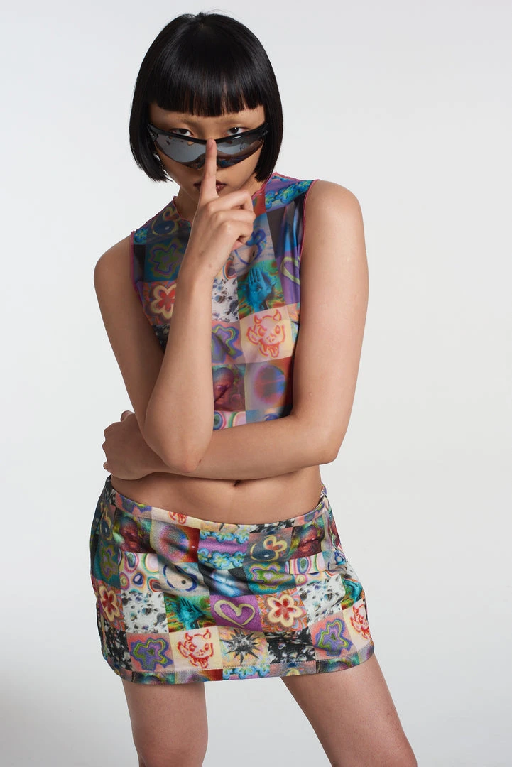 The Ragged Priest psychedelic, patchwork graphic printed mini skirt with side zip fastening.Â