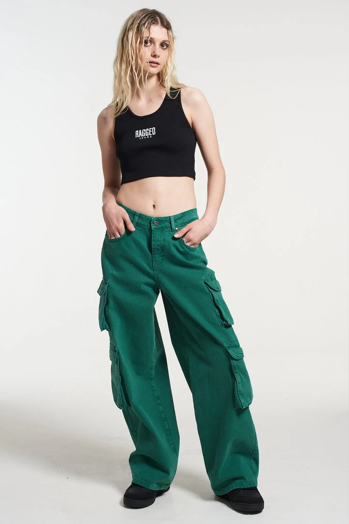 The Ragged Priest Green cargo low rise jeans in our classic release jeans fit.Â