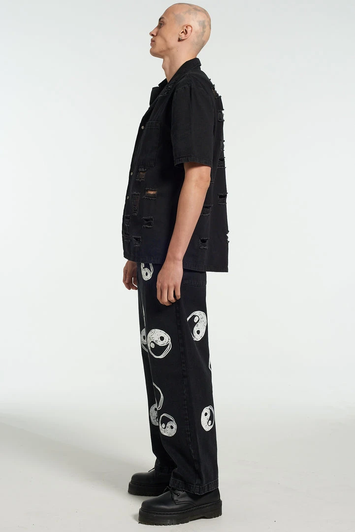 The Ragged Priest men’s charcoal jeans with yin yang hand drawn style printed design.