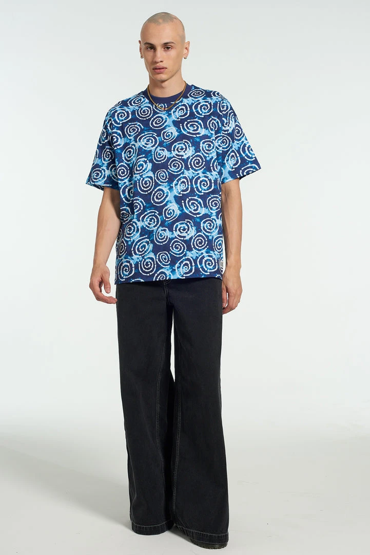 The Ragged Priest men’s Batik inspired swirl print t-shirt in navy and white.