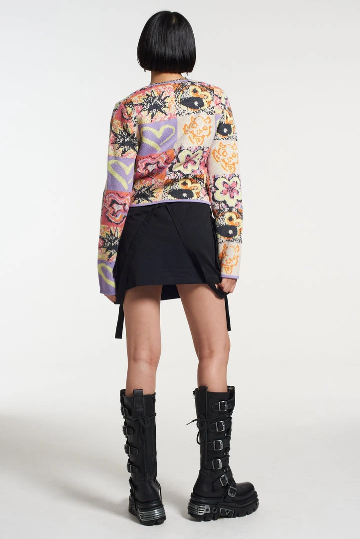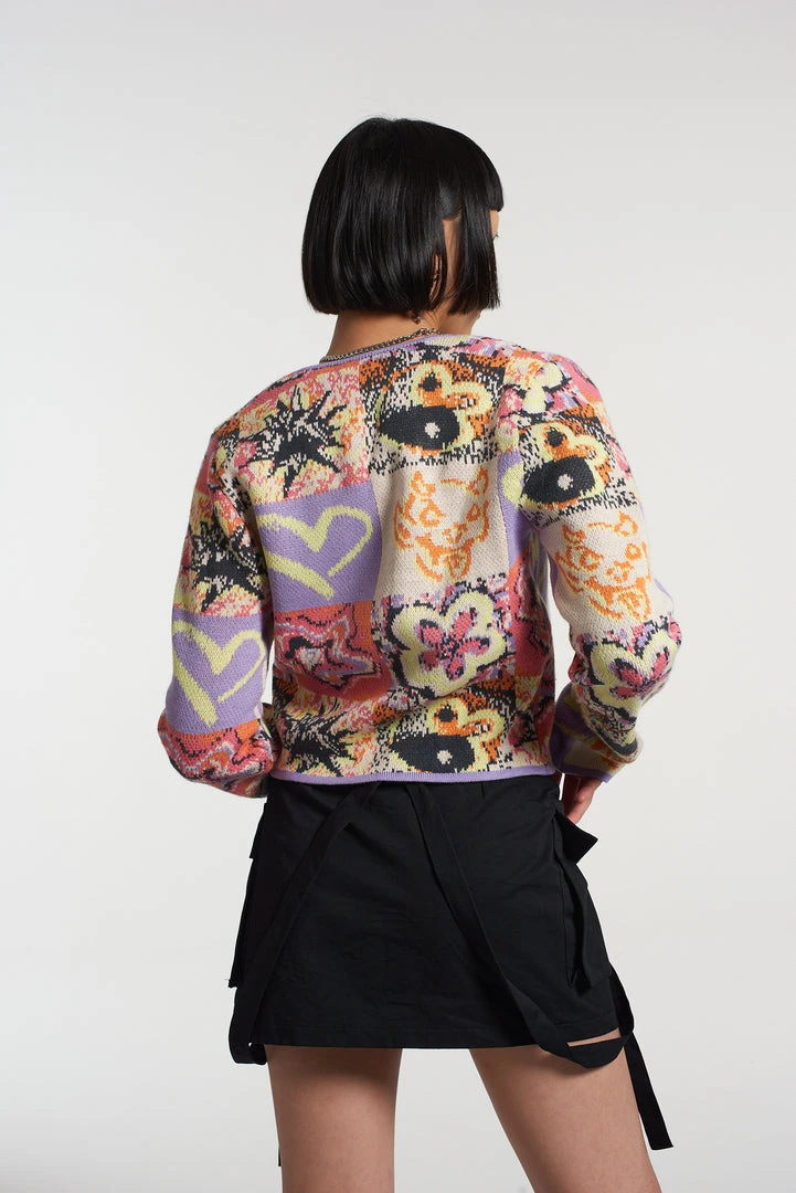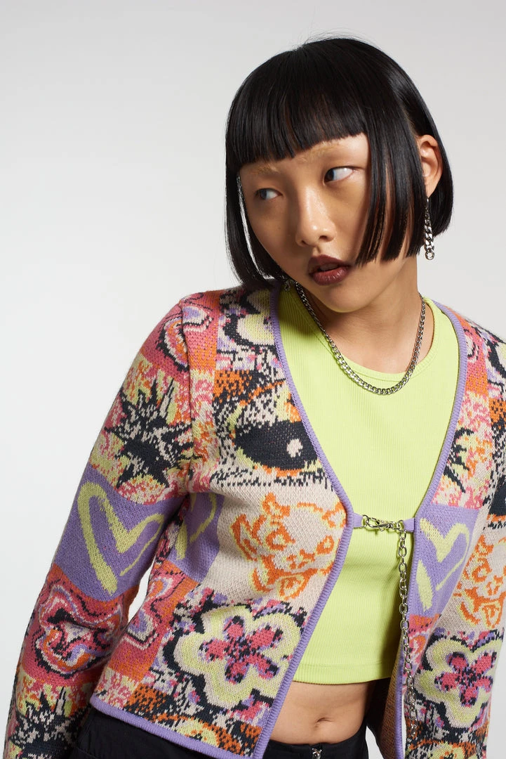 The Ragged Priest Psychedelic, patchwork graphic printed knitted cardigan with silver chain and clasp fastening.