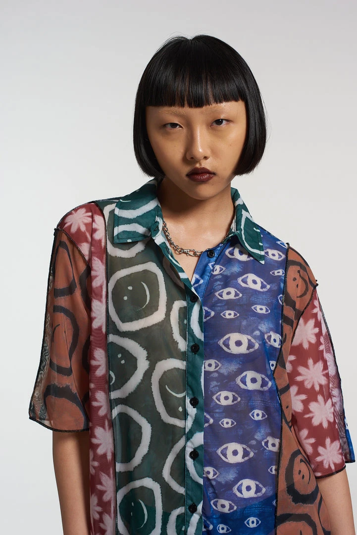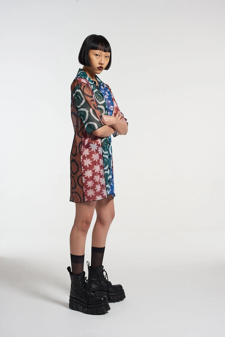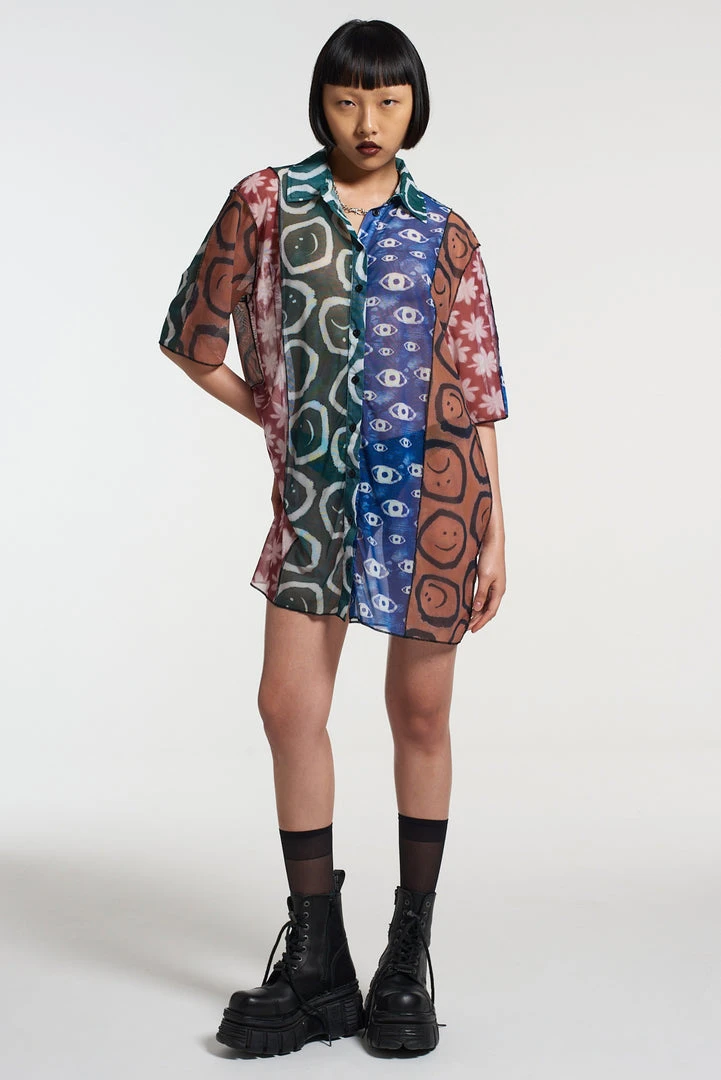 The Ragged Priest Multi panel patchwork graphic printed mesh short sleeved shirt dress.Â