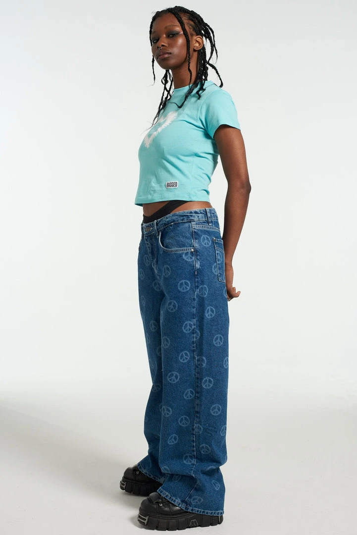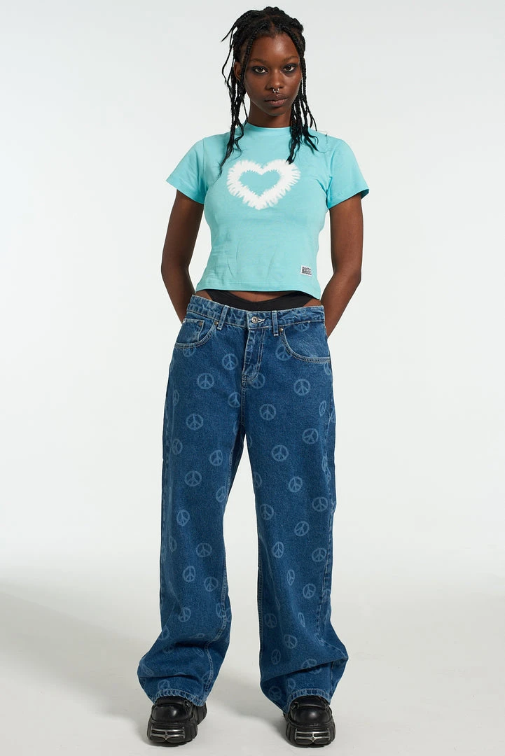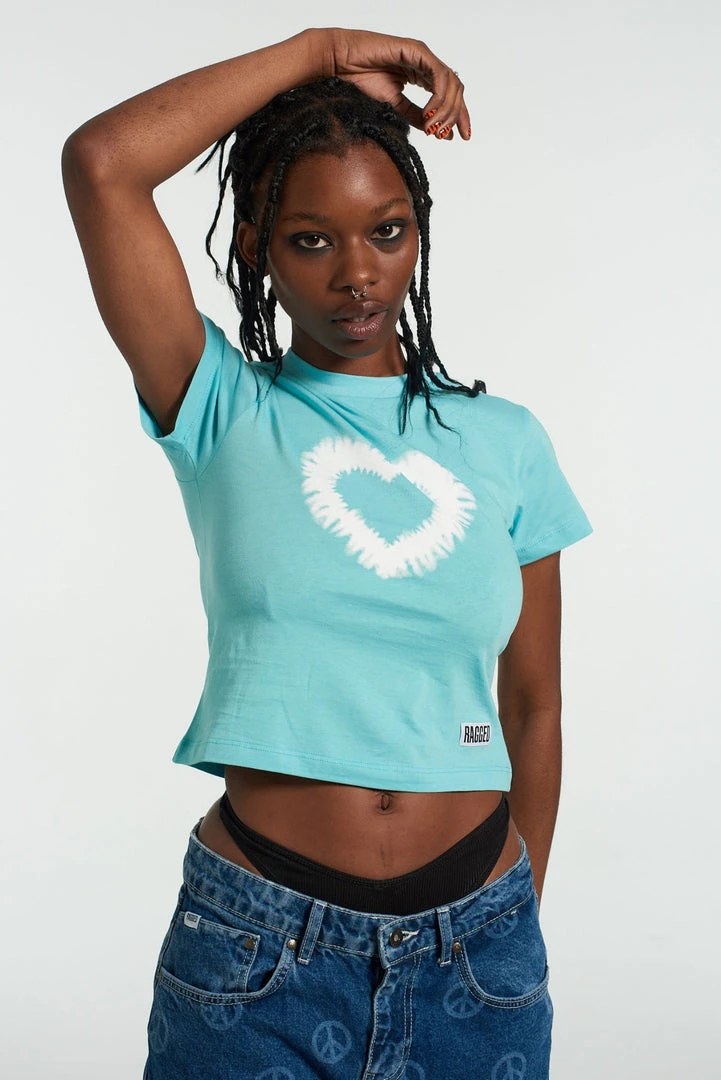 The Ragged Priest Blue t-shirt cropped top with central white Batik inspired heart print.