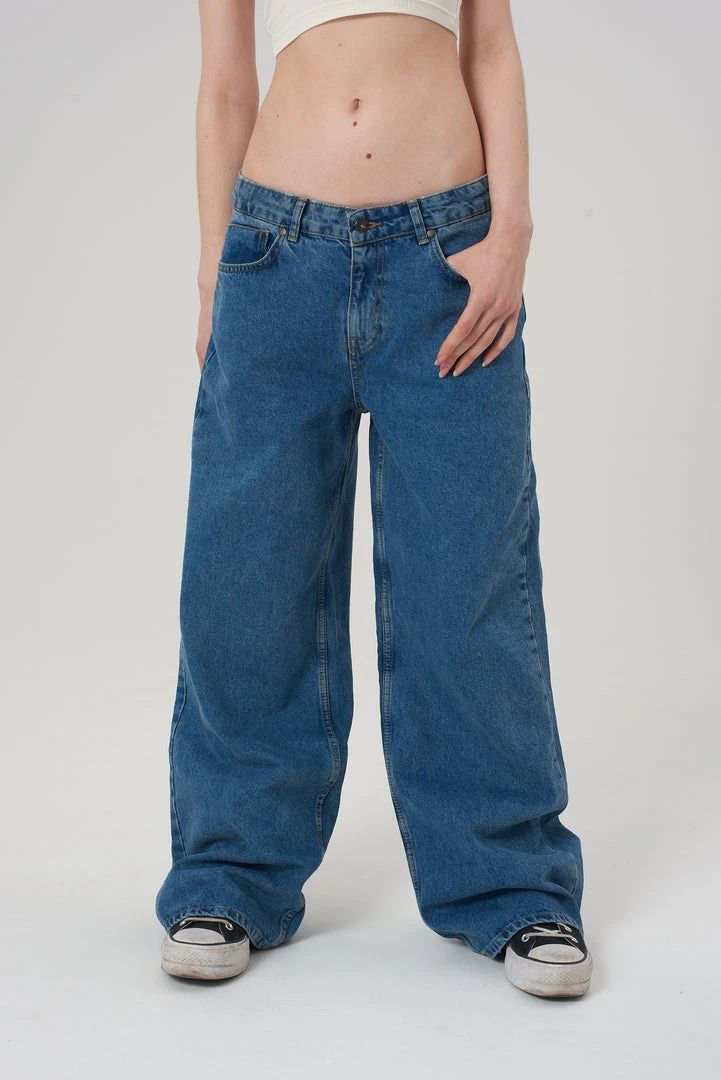Ragged Jeans low rise baggy wide leg jeans in mid blue with “RAGGED Jeans” belt loop tab.